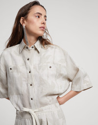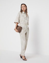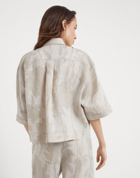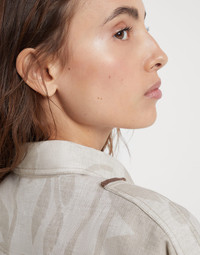 The season’s details update the style of this lessivé linen shirt in a contemporary way. The material’s rustic appearance is enriched by the Ramage print, which recreates a botanical design that highlights the season’s colors. The monili detail on the epaulettes completes the style of this comfortable garment. The shirt is designed to pair with the trousers made in the same fabric to create a sophisticated Coordinated Set. MATERIALS The quintessential summer fiber enriches the collection of Brunello Cucinelli fabrics. With a slightly irregular, dry texture, the fabric serves as the base for a precious nature-themed embroidery. DETAILS Plain front closure with snaps Classic collar Two chest pockets Epaulettes Nickel-free monili decoration 100% LINEN
