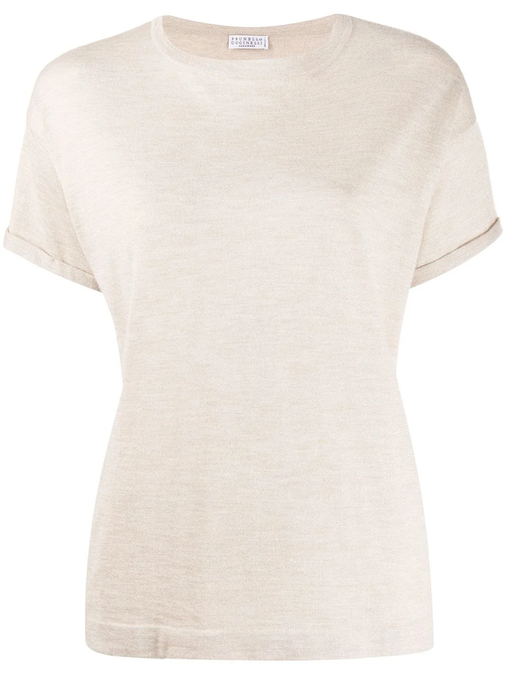 relaxed knitted top Nude cashmere blend knitted top from Brunello Cucinelli featuring a boat neck, short sleeves, a knitted style, a relaxed shape and a boxy fit. Made in Italy Composition Cashmere 51%, Silk 22%, Polyamide 20%, Metallized Polyester 7% SIZE & FIT Model measurements Height 5 ft 9 in(1.75 m) Bust/Chest 32.67 in(83 cm) Hips 36.22 in(92 cm) Waist 24.8 in(63 cm)