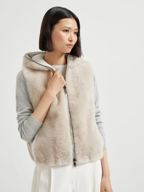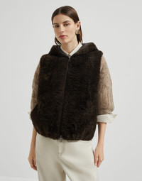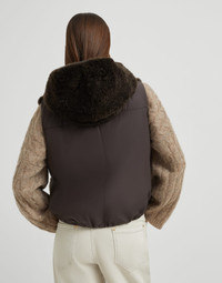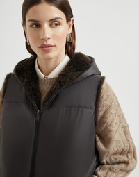 Refined fabrics and feminine details reinterpret the reversible vest with a modern touch. On the exterior, precious cashmere shearling introduces an elegant contrast with the sporty style of the silk-blend taffeta back. The reversible side showcases the compact and lightweight look of water-resistant nylon. Enriched with an elegant decoration, the edges of the hood and zipper closure are embellished with Precious trim, requiring approximately 4 meters of monili to embroider a fine shiny stripe. Lightweight Thermore® padding guarantees warmth and makes the garment ideal to wear especially in the first months of the season. MATERIALS The new refined cashmere shearling is characterized by soft wool that is cut short to give a full and even effect. The rear exterior displays lightweight taffeta, a fine, shiny, smooth and slightly shimmering fabric that combines the refined qualities of silk with the technical characteristics of the synthetic fiber. Lastly, the reversible side showcases water-resistant nylon. A lightweight Thermore® padding guarantees a balanced weight without compromising the right amount of protection. DETAILS Two-way zip closure Hood Thermore® padding Hand pockets Elasticized hem Nickel-free monili decoration 100% FUR