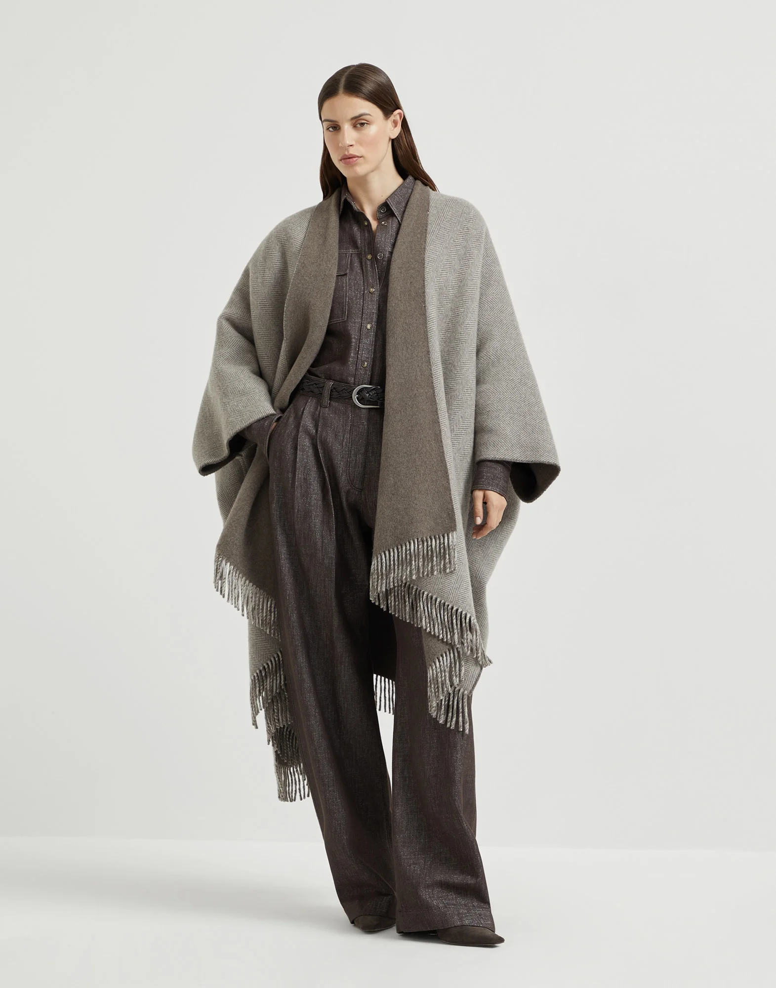 This reversible cashmere sparkling flannel poncho strikes the perfect balance between cozy comfort and timeless style. Warm and soft flannel is enriched with a lame thread that illuminates the texture with small reflections of light. The fringed hem complements the loose silhouette that drapes over the body and follows every move with an elegant naturalness. MATERIALS Sparkling flannel combines the excellence of cashmere fibers with a metallic thread to enrich the traditional diagonal weave with intense shiny reflections. Its compact texture is nice and soft. DETAILS Hem with fringe Special workmanship 93% CASHMERE, 5% VISCOSE, 2% POLYESTER