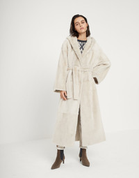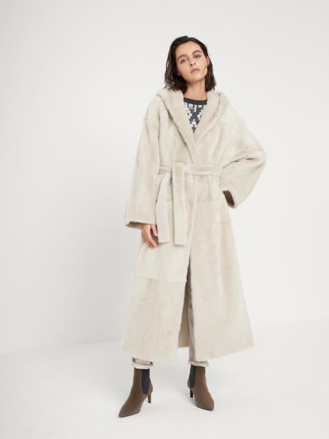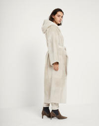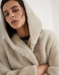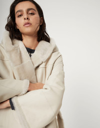 The beautiful, cozy look of shearling is fully showcased in this new reversible coat. Soft and full, the exterior accentuates the garment’s elongated design, while the interior displays a luxurious nappa texture. The hood and the waist belt update the timeless silhouette, while three rows of shiny monili embroidered behind the neck complete the sophisticated look of the piece with a delicate sparkle. MATERIALS Manufacturing of the soft leather provides a very supple and regular final effect. The reverse side is characterized by a pleasant, slightly nappa-like look. DETAILS Strap closure Hood Hand pockets *Reversible side* Two interior pockets Nickel-free monili decoration 100% FUR