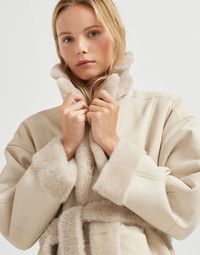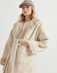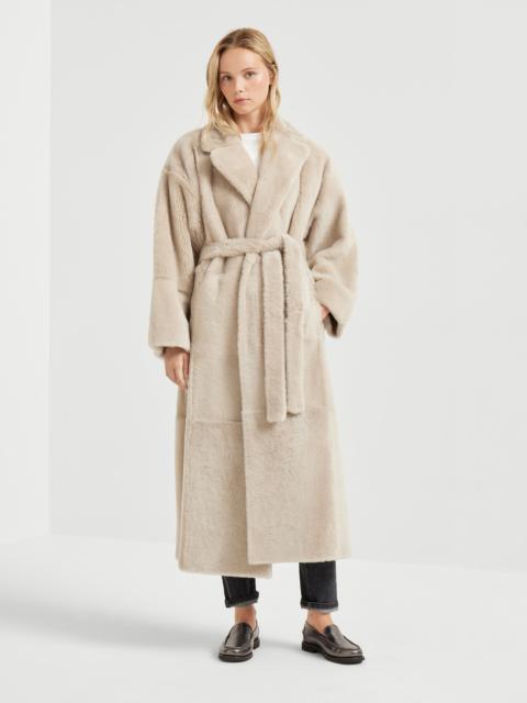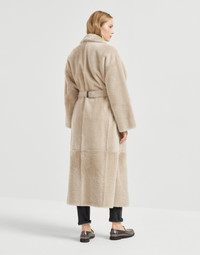 The beauty and sophisticated look of refined shearling is fully showcased in this new reversible coat. Soft and slightly full, the exterior accentuates the garment’s elongated design, while the interior displays a luxurious nappa texture. The belt gathers the volume at the waist to create a feminine silhouette. A delicate shiny monili embroidery illuminates the rear belt loop with a delicate sparkle in true Brunello Cucinelli style. MATERIALS Manufacturing of the soft leather provides a very supple and regular final effect. The reverse side is characterized by a pleasant, slightly nappa-like look. DETAILS Lapel collar Vertical hand pockets Detachable tie belt Double back vent Nickel-free monili decoration *Reversible side* Patch hand pockets 100% FUR