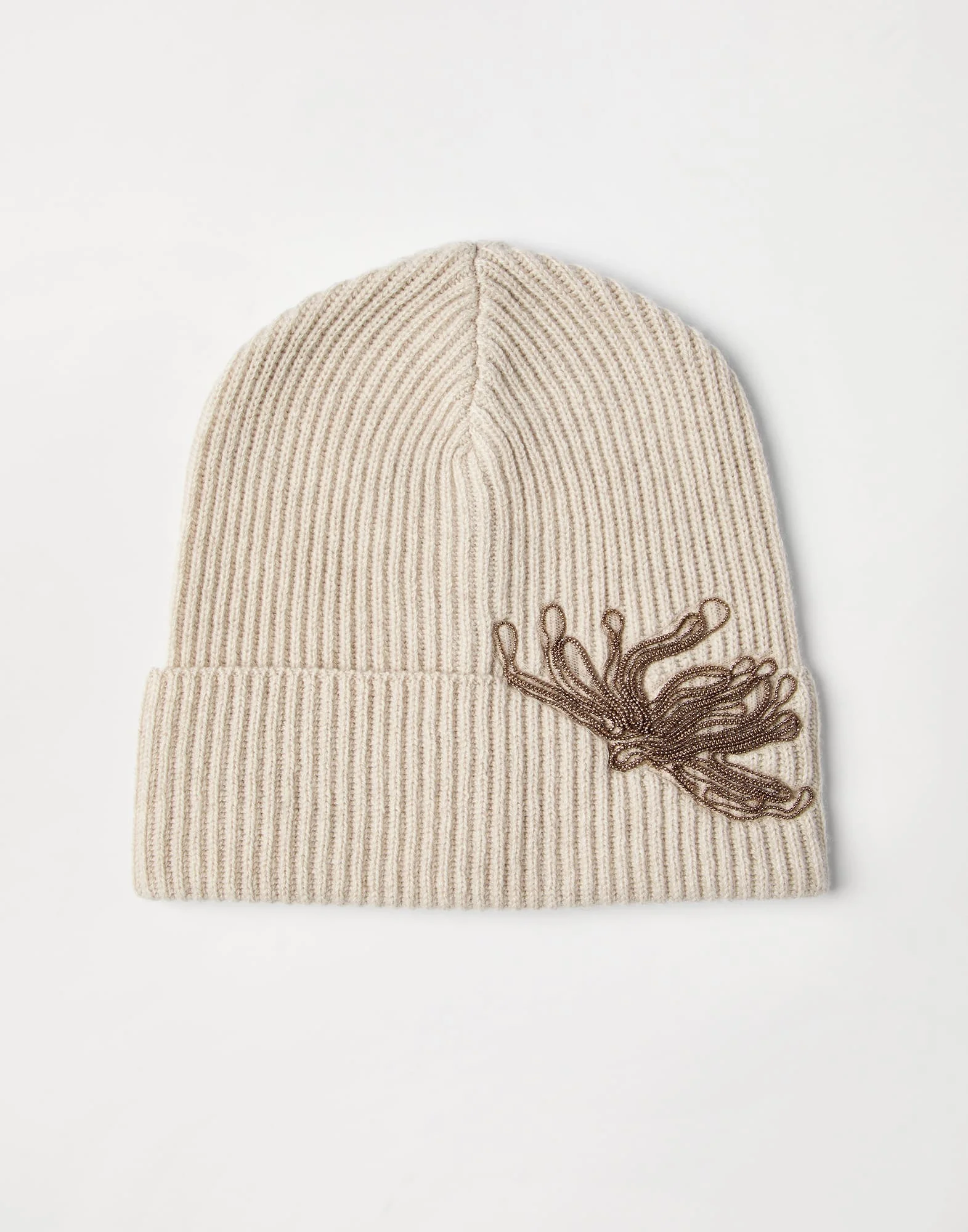 The iconic yarn of Brunello Cucinelli collections enriches the classic knit beanie. The soft and enveloping texture of pure cashmere is enhanced by a refined floral-inspired embroidery made of thin strands of sparkling monile, for a sophisticated touch. MATERIALS The noble cashmere fiber is characterized by its extreme fineness and precious insulating qualities, which simultaneously guarantee warmth, protection and lightness when worn. DETAILS Rib knit Nickel-free monili decoration 100% CASHMERE