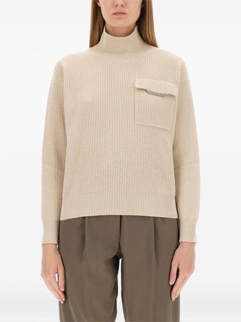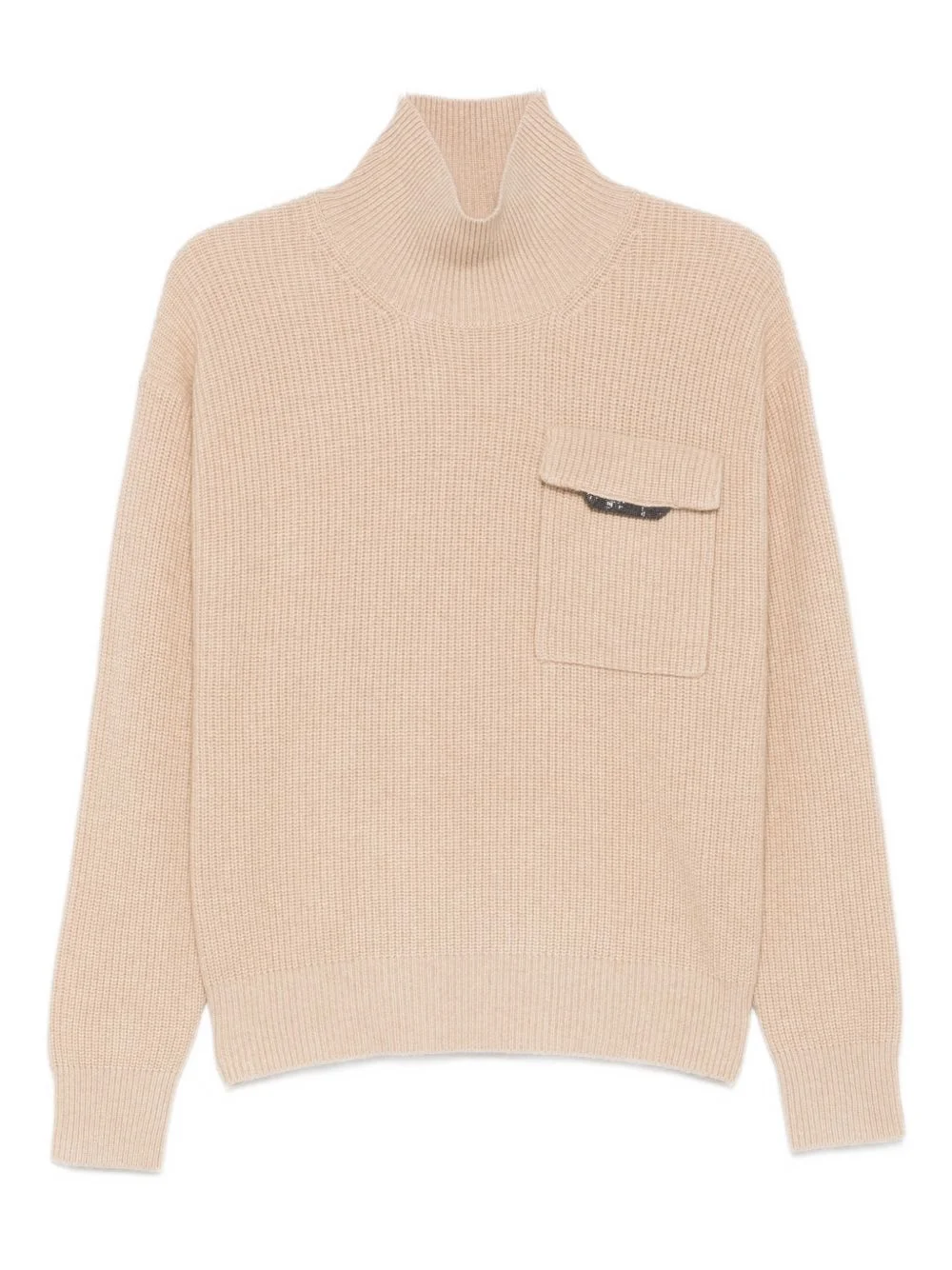 ribbed high-neck sweater Highlights - Beige - Ribbed knit - High neck - Long sleeves - Chest pocket - Brass detail Made in Italy Composition Cashmere 100% Washing instructions Hand Wash