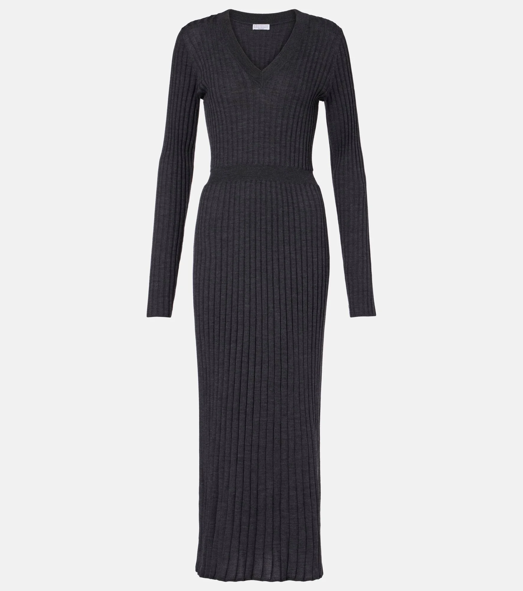 Brunello Cucinelli's designs are created in Solomeo, a medieval hamlet whose art and traditions are woven into the house's every fiber. This sweater dress is rib-knitted from virgin wool and features a V-neckline. Product Details - Material: 100% virgin wool - Care instructions: hand wash - Made in Italy - Designer color name: Grigio Scuro - Item color: gray - Collar: V-neck - Item number: P01091755 Size & Fit - True to size - Fitted - Stretchy fabric - Height of model is 179cm-70.5" and wears a size XS