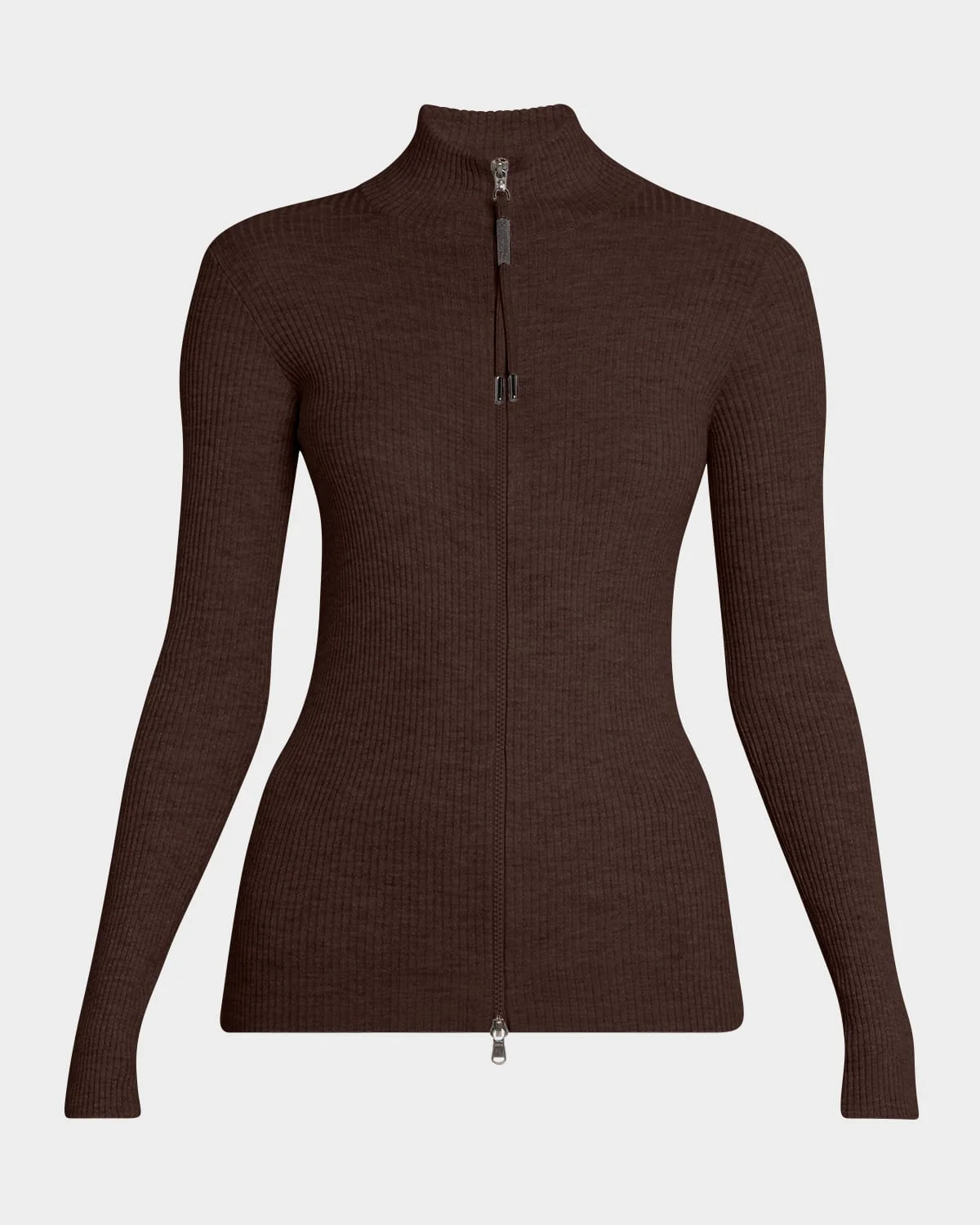 Ribbed Long-Sleeve Monili Zip-Up Top