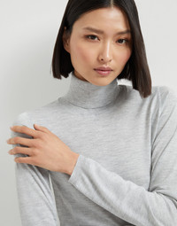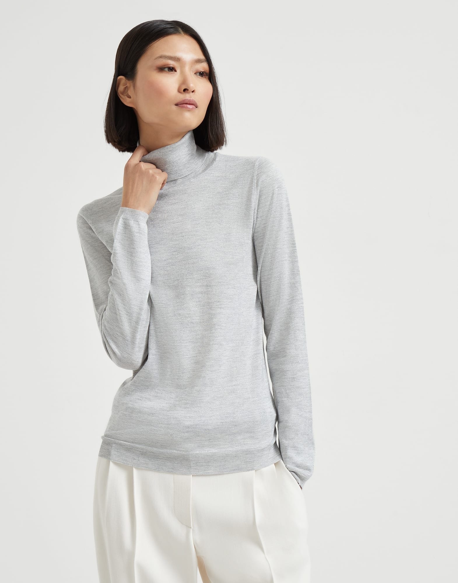 The excellence of Brunello Cucinelli materials enriches the essential shape of the new turtleneck sweater. An ultra lightweight and soft texture of the cashmere and silk yarn combines with the regular fit in both the chest and shoulders which is pleasing to wear. MATERIALS Cashmere and silk fibers are manufactured together with a fine lame thread to enrich the texture with delicate metallic reflections. The presence of a synthetic fiber provides added comfort. DETAILS High collar Regular shoulder Regular sleeve Plain stitch 51% CASHMERE, 22% SILK, 20% NYLON, 7% POLYESTER