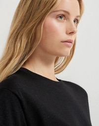 Sparkling metallic reflections enrich the ultra-lightweight cashmere and silk yarn, illuminating the essential lines of this sweater. The knitting of the soft yarn utilizes a lame thread that spreads a delicate shimmer throughout the garment’s surface. The silhouette features regular proportions. MATERIALS Cashmere and silk fibers are manufactured together with a fine lame thread to enrich the texture with delicate metallic reflections. The presence of a synthetic fiber provides added comfort. DETAILS Crew-neck Drop shoulder Sleeves with cuff Plain stitch 51% CASHMERE, 22% SILK, 20% NYLON, 7% POLYESTER