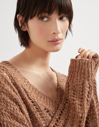 Inspired by the rustic textures of summer imagery, this Dazzling sweater is the result of refined materials and precious details. The ribbed openwork creates a very loose striped pattern which plays with solid and empty spaces throughout the garment, illuminating it with the shiny reflections of the sequined yarn. The net-like effect provides a lightweight appearance, while the silhouette features relaxed proportions with dropped shoulders and generous sleeves. MATERIALS The crafting of the silk and linen malfile yarn uses threads that are slightly irregular in thickness to create a three-dimensional texture. The rustic, natural look of the yarn is softened by the presence of the micro sequins incorporated into it, spreading sparkling reflections throughout the garment’s surface. DETAILS V-neck Drop shoulder Wide sleeve Various knit stitches 36% SILK, 34% LINEN, 17% NYLON, 13% POLYESTER