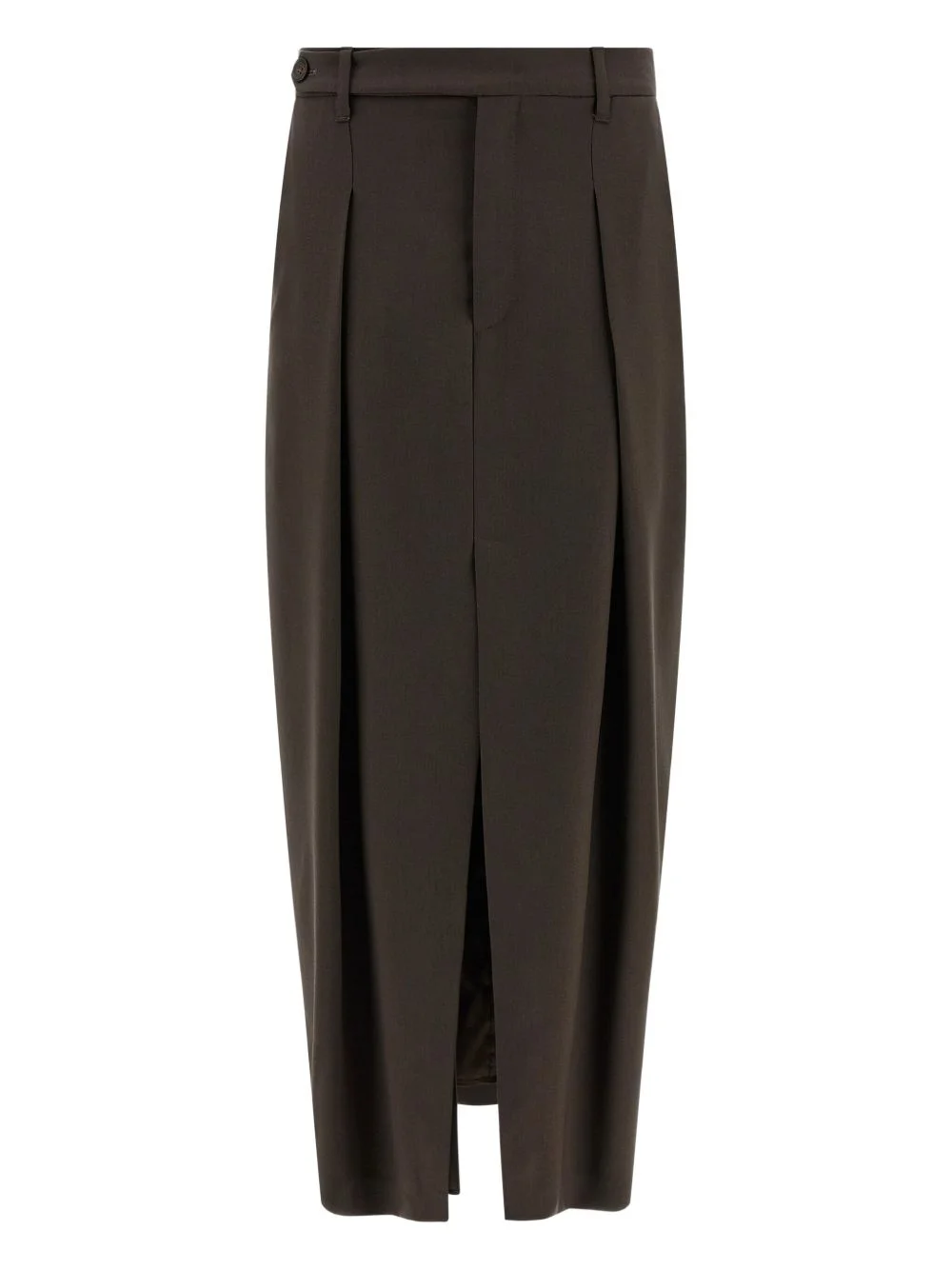curved front-split midi skirt Highlights - Brown - Front split - Back monile detail - Hook button zip closure - Front back gusset pins - Pockets Made in Italy Composition Virgin Wool 70%, Mohair 30% Washing instructions Read Manufacturer Guidelines