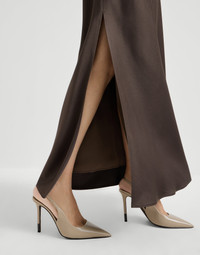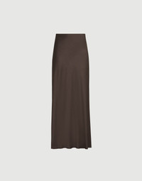 Flowing, essential lines define this satin cady fluid skirt. The fabric’s particular bias-cut and the two side slits give a sense of movement to the straight, fitted silhouette, emphasizing its lightness and airiness. The pull-on design perfects the skirt’s comfort. MATERIALS Shiny and silky, the cady satin combines acetate and viscose fibers to offer a compact texture that remains fluid and very comfortable at the same time. DETAILS Pull-up skirt Side vents at bottom Silk-blend crepe lining 61% ACETATE, 39% VISCOSE