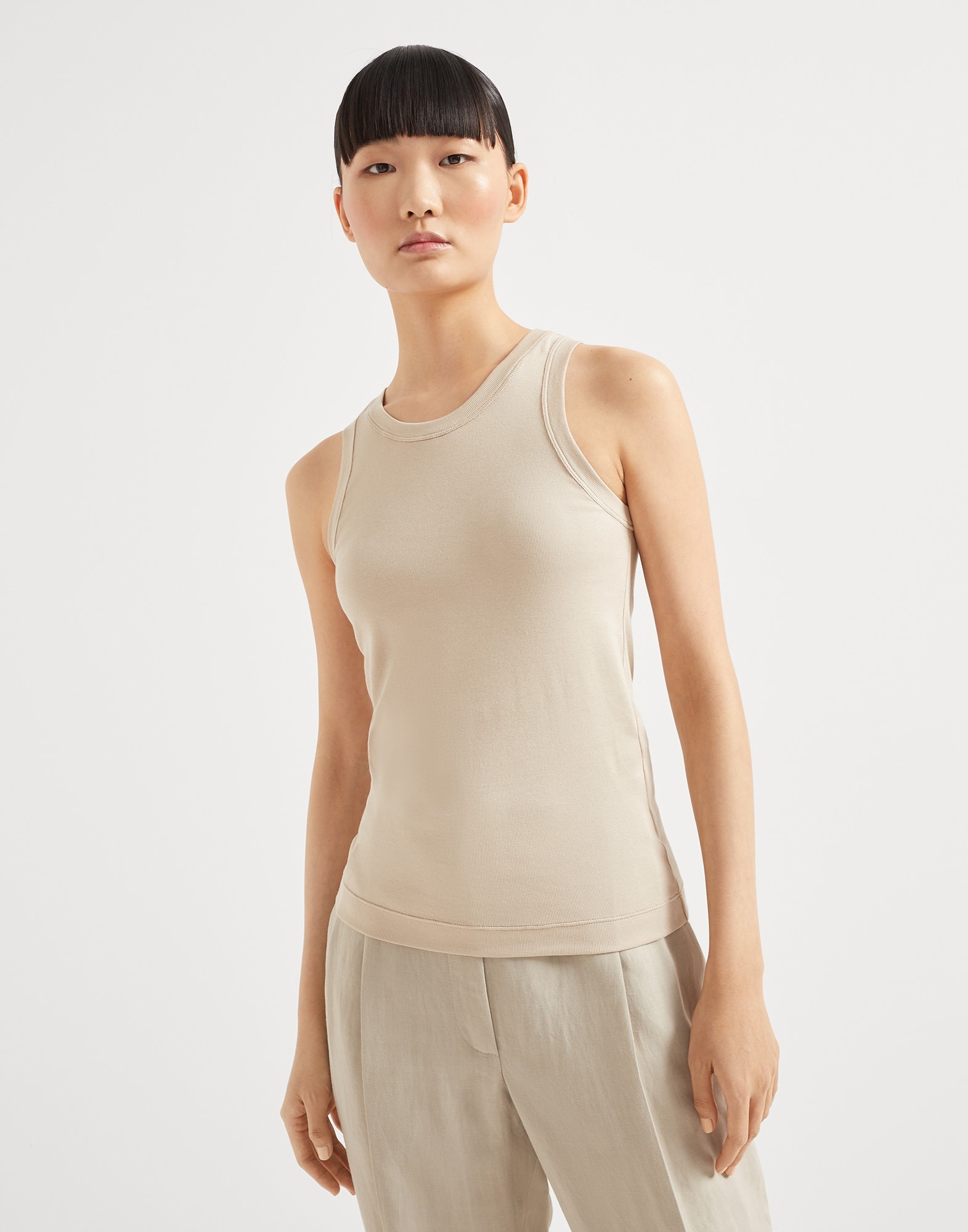 This stretch cotton jersey top is an essential piece of the year-round wardrobe. Versatile and comfortable, the garment features a regular silhouette with fitted proportions to the body, while the shiny monili detail elevates the casual feel with a sophisticated, feminine note in true Brunello Cucinelli style. MATERIALS A small percentage of spandex makes the lightweight and soft cotton jersey comfortable and pleasant to wear. DETAILS Crew-neck Nickel-free monili decoration 94% COTTON, 6% ELASTANE