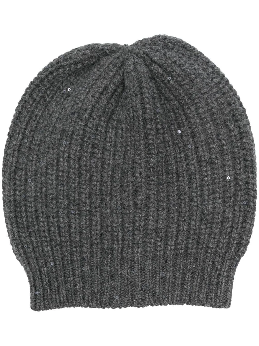 sequin-embellished knit beanie charcoal grey cashmere-silk blend fine knit sequin embellishment curved peak Made in Italy Composition Polyamide 100%, Cashmere 90%, Silk 10% Washing instructions Hand Wash
