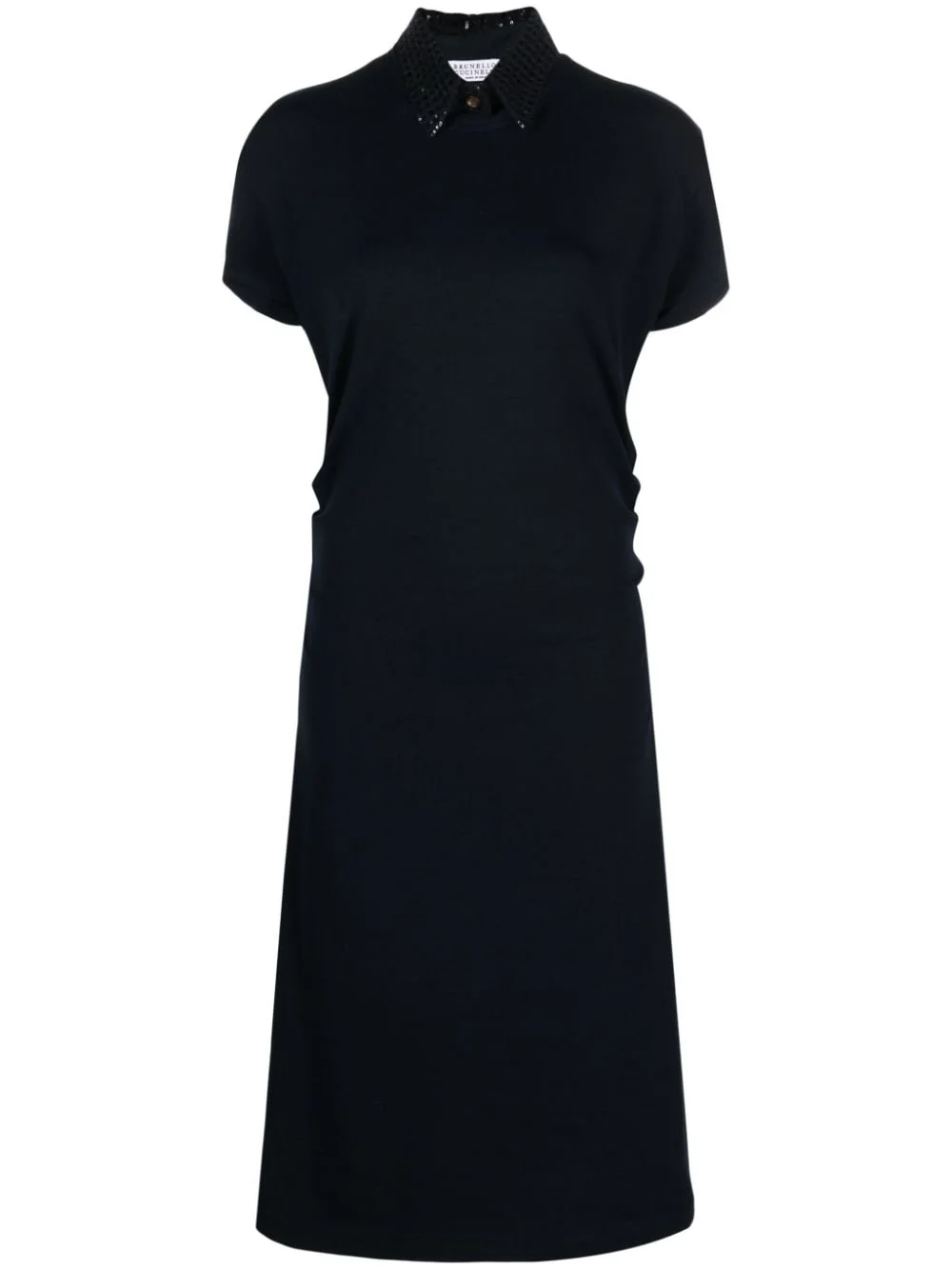 sequin-embellished midi dress Highlights - Navy blue - Virgin wool blend - Sequin embellishment - Ruched detailing - Classic collar - Short sleeves - Shift style - Mid-calf length - Straight hem Made in Italy Composition Outer: Polyester 100%, Virgin Wool 94%, Mohair 50%, Polyamide 36%, Wool 14%, Spandex/Elastane 6% Lining: Acetate 74%, Silk 26% SIZE & FIT Model measurements Height 5 ft 10 in(1.78 m) Bust/Chest 31.49 in(80 cm) Hips 36.22 in(92 cm) Waist 25.59 in(65 cm) FittingInformation Designed for a close fit throughout Made with a midweight knit, this piece offers some stretch This piece fits close in all sizes – take your usual size Washing instructions Dry Clean Only