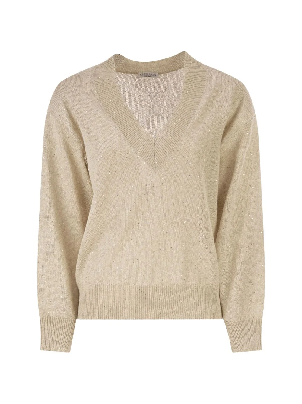 sequin-embellished V-neck sweater Highlights - Beige - Ribbed trim - Sequins embellishment - Ribbed cuffs Made in Italy Composition Polyester 100%, Linen/Flax 94%, Cotton 6% Washing instructions Read Manufacturer Guidelines