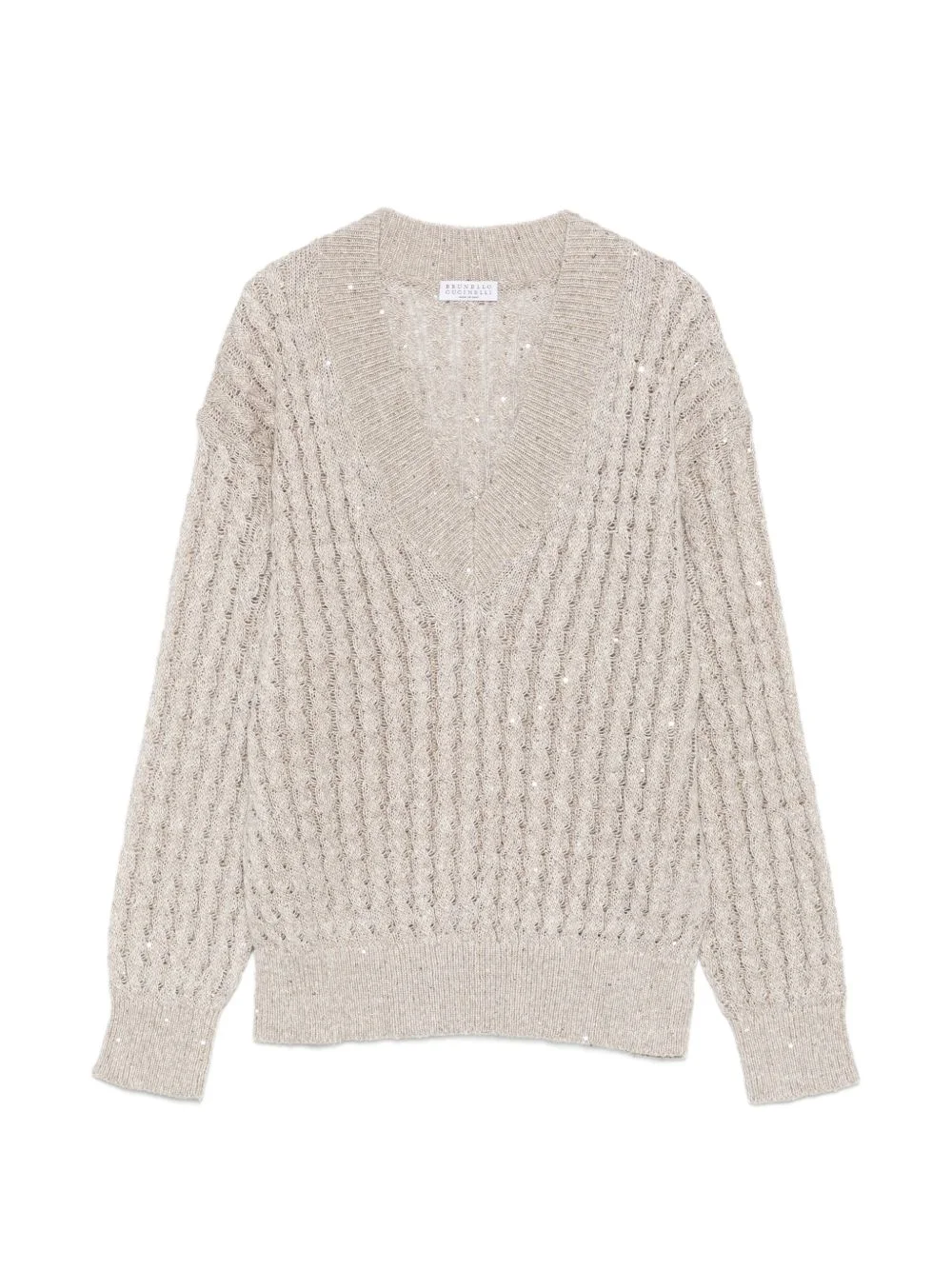 sequin-embellishment V-neck sweater Highlights - Beige - Sequin embellishment - V-neck - Knitted construction - Long sleeves - Ribbed hem Made in Italy Composition Polyester 100%, Linen/Flax 94%, Nylon 6% Washing instructions Dry Clean Only