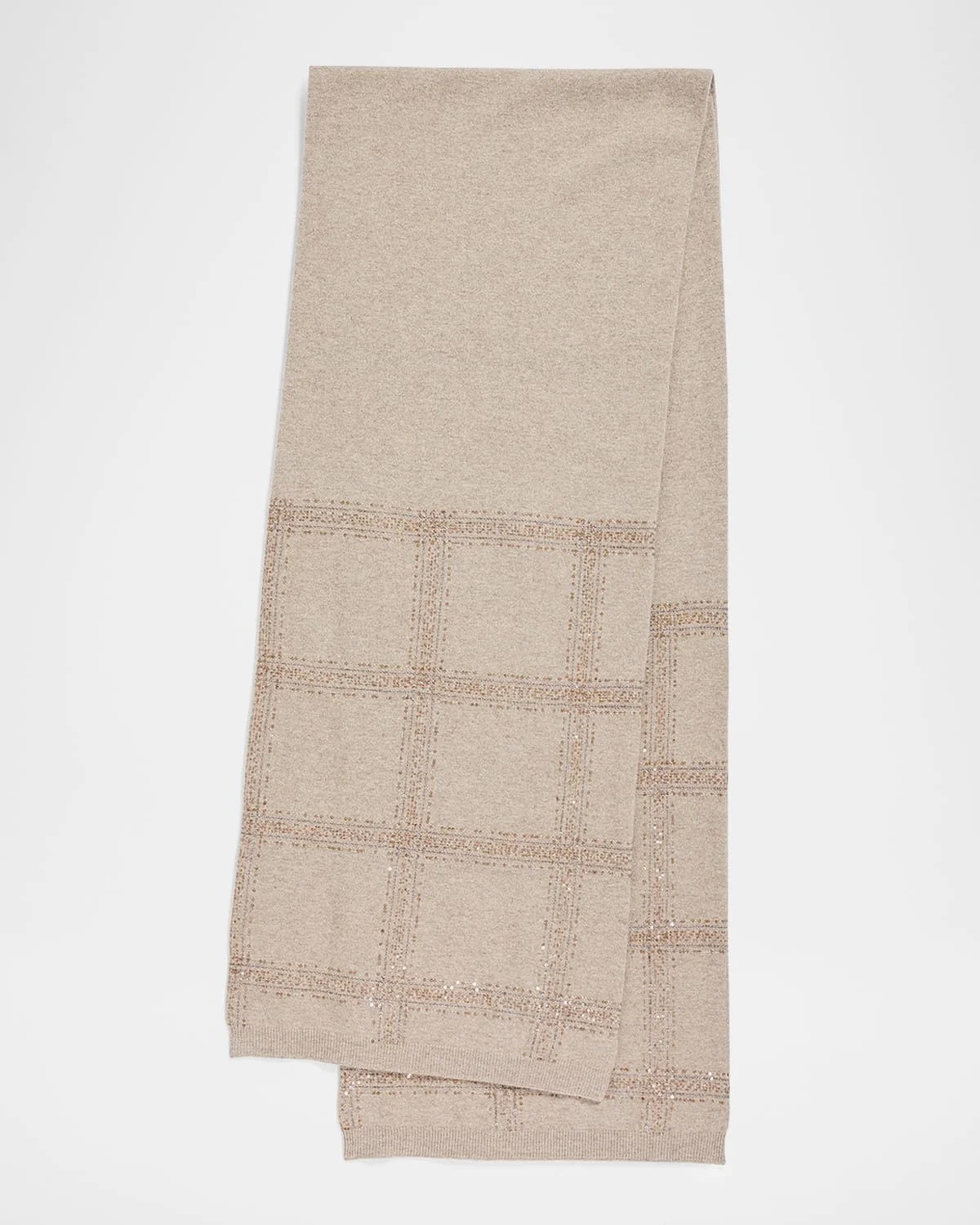 Brunello Cucinelli scarf shimmers with a sequined check pattern. Crafted from a luxe blend of wool and cashmere, it envelops the body with warmth. May be styled multiple ways Wool/cashmere/polyester Spot clean Imported