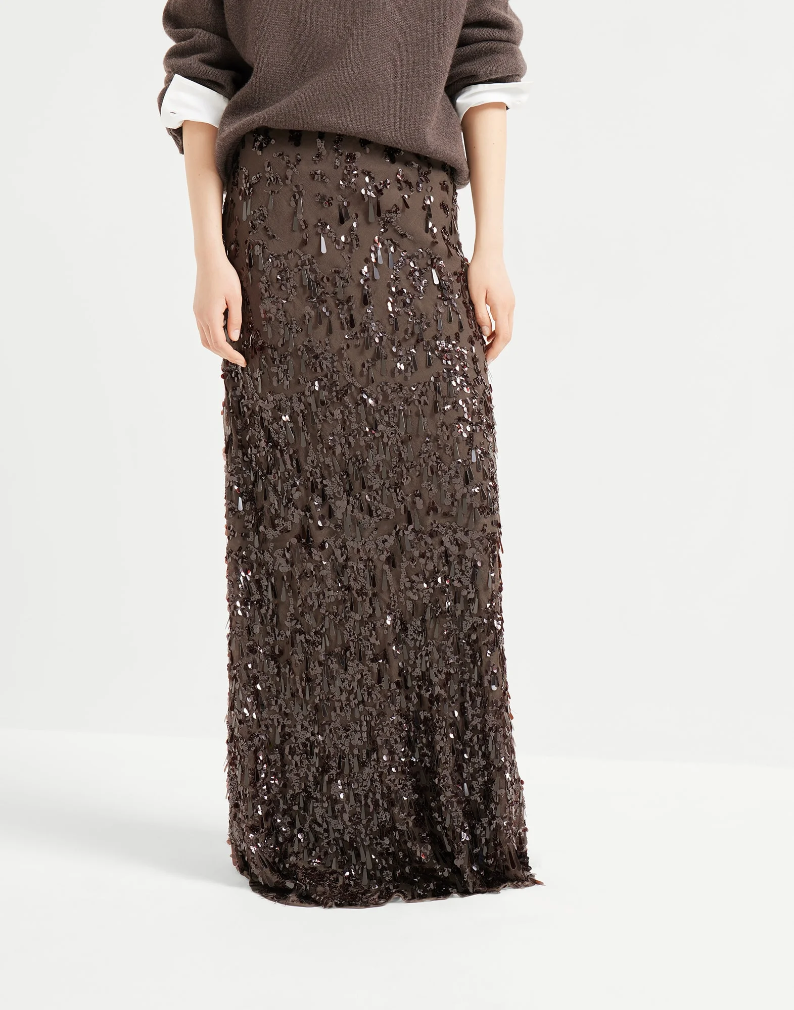 This crispy silk long mermaid skirt with swing drops embroidery conveys a sophisticated, feminine allure. The crisp, weightless texture of the fabric stands out with a precious embroidery of shimmering sequins, applied in different shapes and sizes to create a striking three-dimensional effect that brings the essential silhouette to life, playing with delicate reflections and transparency. The mermaid design stands out for its volume that develops straight and fitted through the hips before gently flaring at the bottom, creating a sophisticated and fluid sense of movement. MATERIALS Refined Crispy silk is an ultra fine fabric characterized by a transparent, matte look. The fabric’s delicate color stems from a particular dye that preserves the fiber’s natural textured effect. DETAILS Side zip closure Silk-blend crepe lining 100% SILK