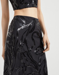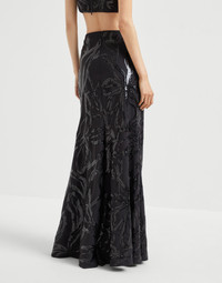 A precious embellishment of the season elevates the feminine feel of this tropical luxury wool long mermaid skirt with dazzling floral embroidery. Inspired by the beauty of nature, the shimmering abstract floral design is crafted using a sequin embroidery that illuminates the skirt with an elegant sparkle. The mermaid design stands out for its volume that develops straight and fitted through the hips before gently flaring at the bottom, creating a sophisticated and fluid sense of movement. MATERIALS The precious fabric combines virgin wool and a percentage of synthetic fiber to ensure comfort, while the surface is enriched with an elegant sequin embroidery, which plays delicately with reflections and introduces a sophisticated texture. DETAILS Back zip closure Silk-blend crepe lining Asymmetrical hem 75% VIRGIN WOOL, 23% NYLON, 2% ELASTANE