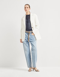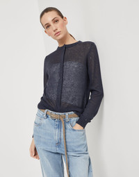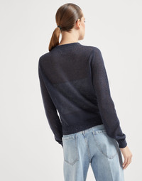 The noble fibers of Brunello Cucinelli knitwear and feminine elements come together in this new linen and silk cardigan. The refined Diamante yarn combines the natural beauty of linen and silk yarns with shiny paillettes, spreading sparkling reflections throughout the garment’s surface. The monili detail behind the neck completes the style of the sweater with an additional shimmering note. MATERIALS Manufacturing of the lightweight Diamond yarn combines the linen and silk natural fibers with tiny paillettes incorporated into the yarn that spread delicate sparkling reflections on the surface of the garment. DETAILS Snap closure Crew-neck Regular shoulder Regular sleeve Plain stitch Nickel-free monili decoration 75% LINEN, 25% SILK