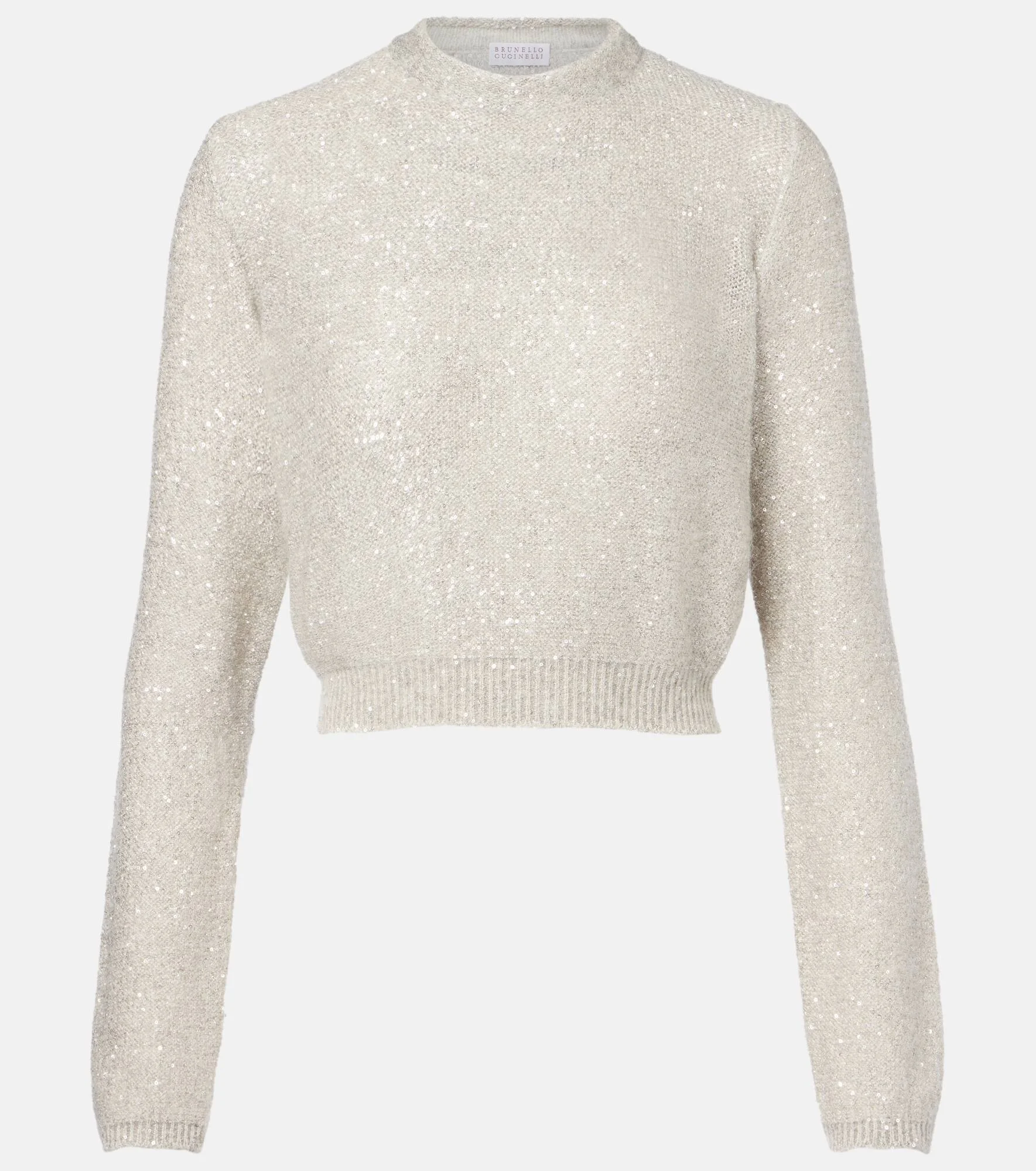 Brunello Cucinelli: where fine Italian craftsmanship, luxurious fabrics and timeless elegance meet. This sweater features shimmering sequin embellishments. Product Details - Material: 52% polyamide, 37% polyester, 11% mohair - Care instructions: hand wash - Made in Italy - Designer color name: Ghiaia+Quarzo - Item color: gray - Details: 100% polyester - Item number: P01143501 Size & Fit - True to size - Cinched waist - Cropped - The model seen in the picture is 178cm-5'10" and wearing a size XS