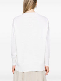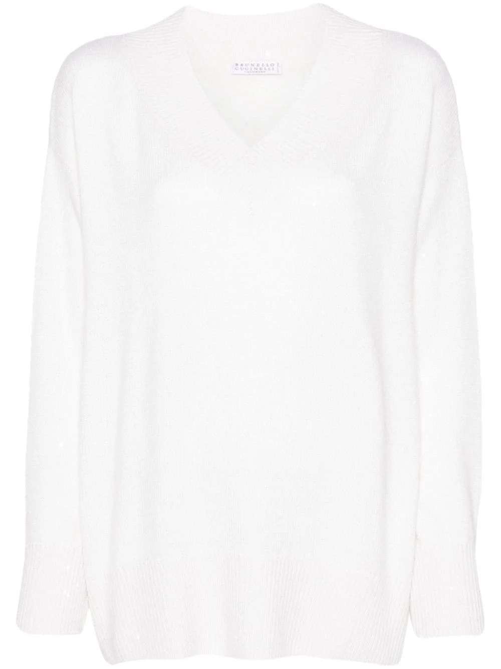 sequined V-neck jumper Highlights - White - Cashmere-silk blend - Knitted construction - Sequin detailing - Ribbed trim - V-neck - Drop shoulder - Long sleeves - Straight hem Made in Italy Composition Polyamide 100%, Cashmere 80%, Silk 20% SIZE & FIT Model measurements Height 5 ft 11 in(1.8 m) Bust/Chest 32.67 in(83 cm) Hips 36.22 in(92 cm) Waist 25.19 in(64 cm) FittingInformation Designed to be unstructured, offering a loose fit throughout The ribbed hem offers a close, comfortable fit Made with a midweight knit, this piece offers some stretch Washing instructions Hand Wash