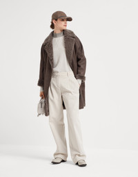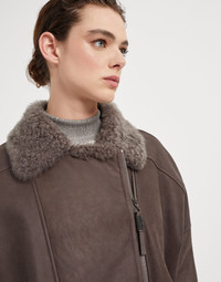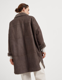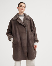 Soft and cozy define the distinctly wintry style of this Fleecy shearling coat. The exterior, characterized by a matte suede texture, showcases soft, full lapels on the front, adding a nice material contrast. The elongated silhouette and slightly oversized proportions offer a comfortable fit, while the precious monili embroidery on the zipper pull introduces a touch of feminine sparkle in true Brunello Cucinelli style. MATERIALS Fleecy shearling showcases a very soft, full appearance, which helps to ensure optimal warmth and comfort. The exterior is characterized by a slightly sueded effect, providing elegant texture contrasts. DETAILS Two-way zip closure Biker-jacket style neck Shearling lining Hand pockets Nickel-free monili decoration SHEARLING