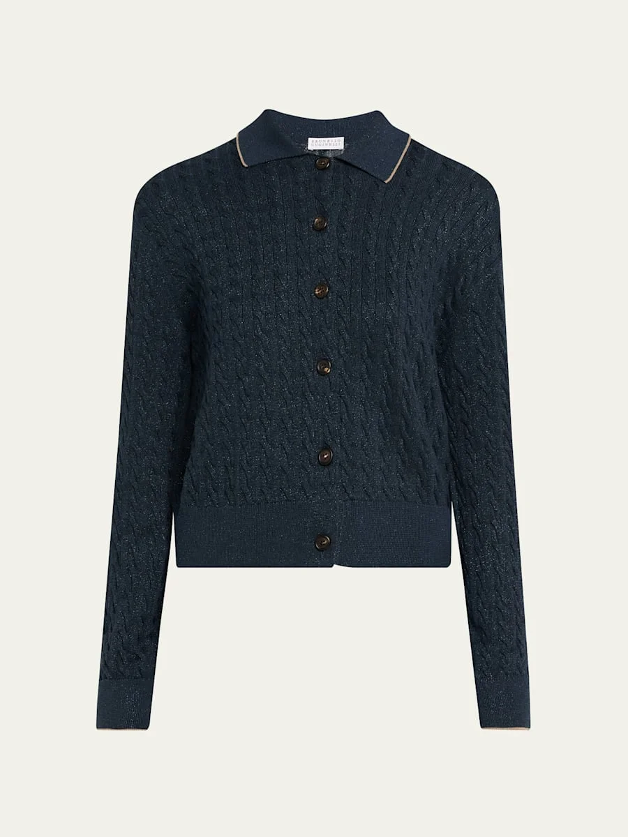 This polo cardigan from Brunello Cucinelli is crafted from shimming cable knit with contrast trim along the collar Spread collar; button front Long sleeves Relaxed fit Hip length Ribbed cuffs and hem Cotton/viscose/metallic fibers Dry clean Made in Italy SIZE amp; FITModel measurements: 5'10" tall Model is wearing a US size 4/Small