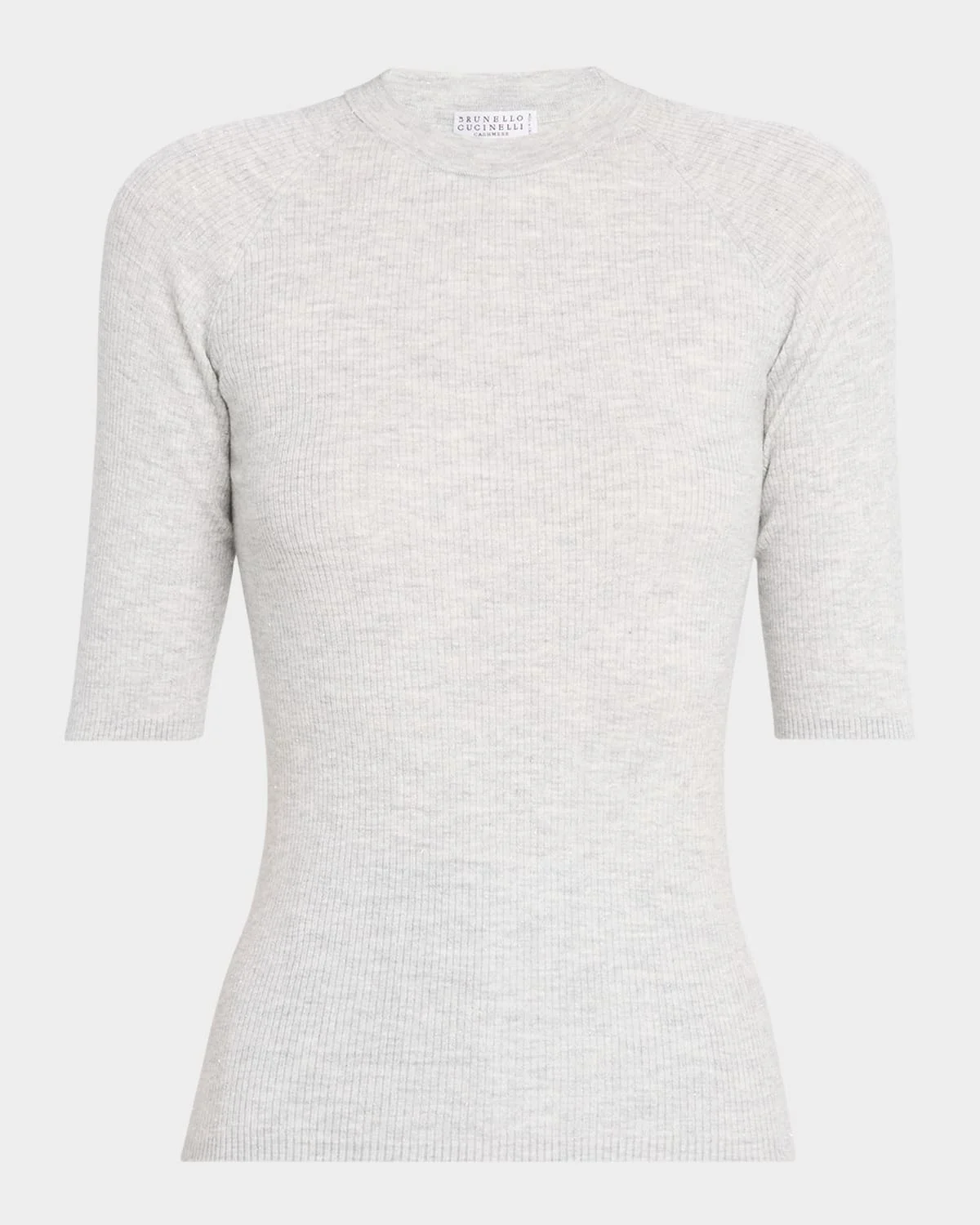 Shimmering Cashmere Stretch Rib Elbow-Sleeve Sweater