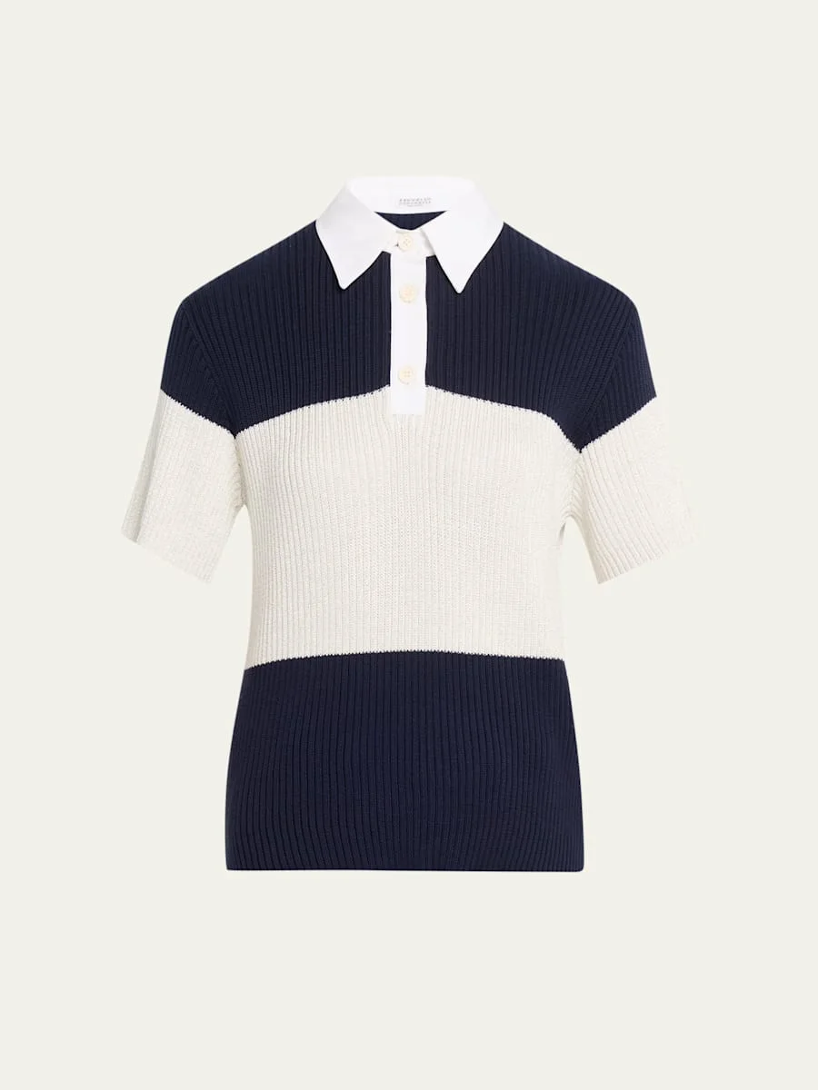Shimmering Striped Cotton Rib Short-Sleeve Polo Sweater