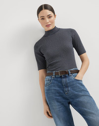 Shiny embellishments enrich this sparkling stripes lightweight sweater in virgin wool and cashmere. The thin striped pattern is enriched with lame threads that stand out against the rib knitting, spreading delicate metallic reflections on the garment’s entire surface. The silhouette offers fitted proportions through the chest, with regular shoulders and sleeves. MATERIALS The manufacturing of the virgin wool and cashmere yarn brings out the noble qualities of the natural fibers to provide a lightweight and cozy feeling when worn. DETAILS Funnel neck Regular shoulder Regular sleeve 90% VIRGIN WOOL, 10% CASHMERE