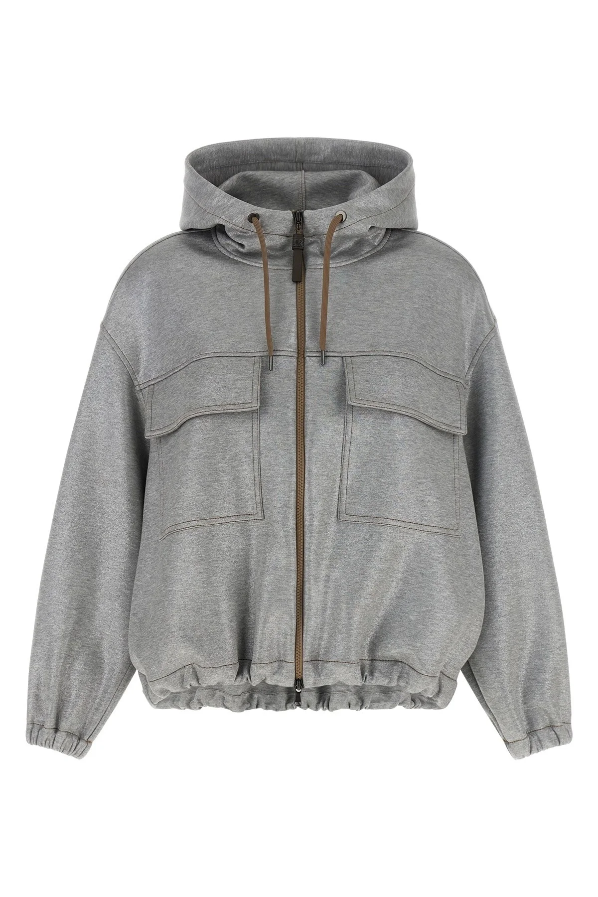 cod. MQ980SQ906C001 Bomber jacket in melange cotton woven with metallic yarn, contrast stitching, adjustable hood, high neck, zip closure with zipper puller 'Shiny Zipper Pull' in jewel on the front, pockets, long sleeves with elastic cuffs and dropped shoulder, elastic with drawstring on the hem, unlined. 'Shiny Zipper Pull' Color: Silver Size & Fit: Comfort fit Composition: 62% cotton, 38% polyamide Made in: Italy