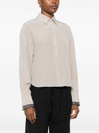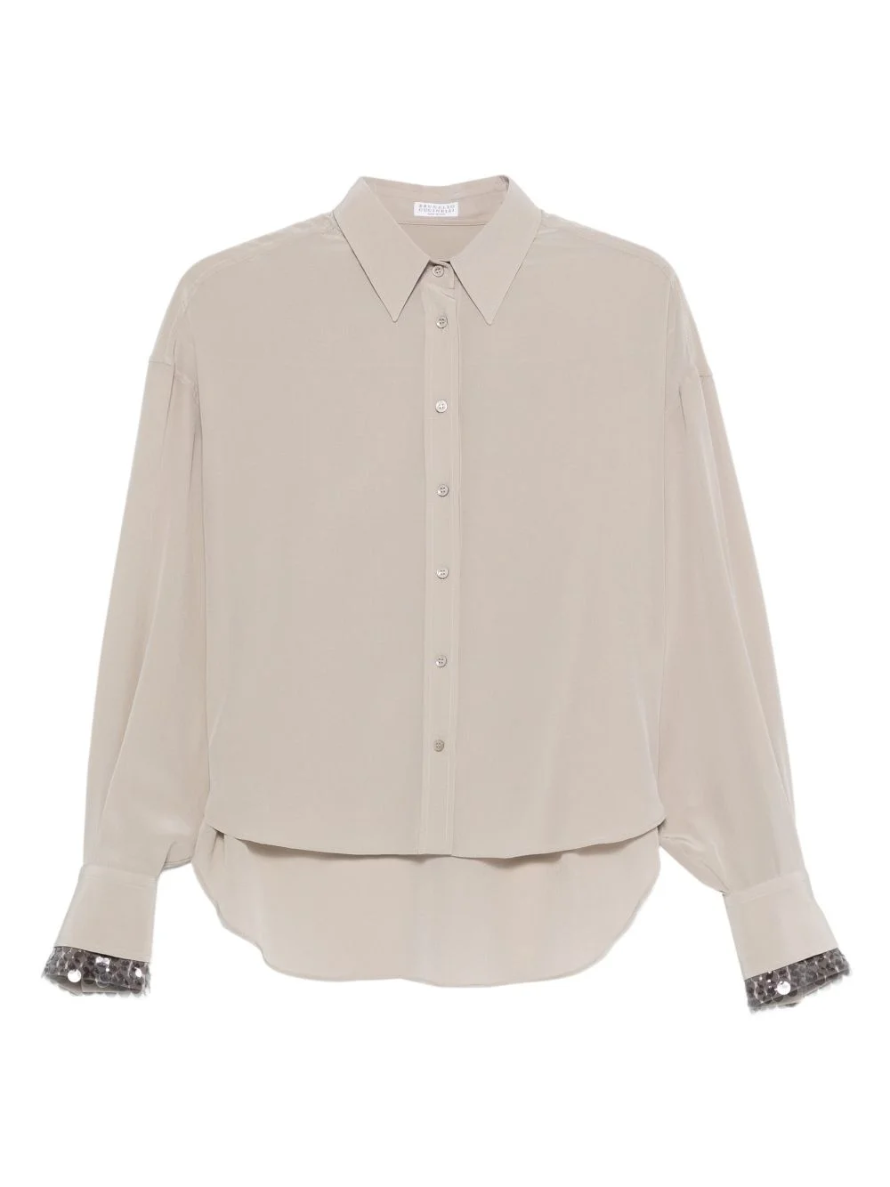 sequin-embellished silk shirt Highlights - Beige - Silk - Button fastening - Collared neckline - Long sleeves - Sequin-embellished cuffs Made in Italy Composition Silk 100% SIZE & FIT Model measurements Height 5 ft 11 in(1.8 m) Bust/Chest 31.49 in(80 cm) Hips 36.61 in(93 cm) Waist 24.4 in(62 cm) Washing instructions Read Manufacturer Guidelines