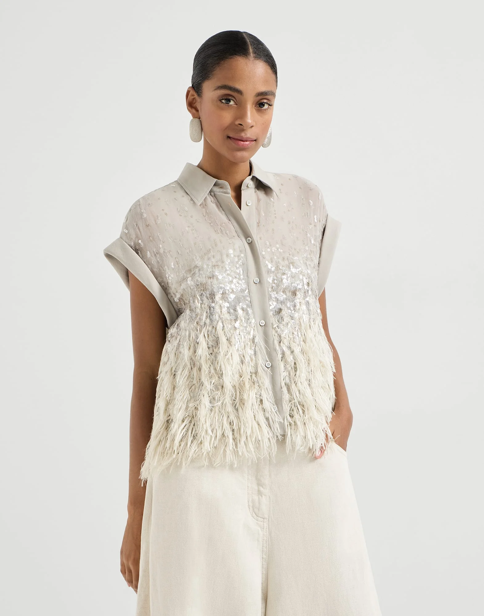 Sophisticated workmanship defines the feminine style of this dazzling degrade embroidery shirt. A cascade of shimmering sequins in different shapes and sizes rests gently on the crispy silk base, creating a delicate degrade effect that gradually fades toward the bottom. The fil coupe technique, with its unexpected frayed appearance, provides a sense of softness and movement. The result is a design with an elegant allure and a dynamic, airy radiance with a shimmer that spreads like a sparkling breeze. MATERIALS Refined Crispy silk is an ultra fine fabric characterized by a transparent, matte look. The fabric’s delicate color stems from a particular dye that preserves the fiber’s natural textured effect. DETAILS Placket closure with mother of pearl buttons Classic collar Unstructured shoulder Special workmanship 100% SILK