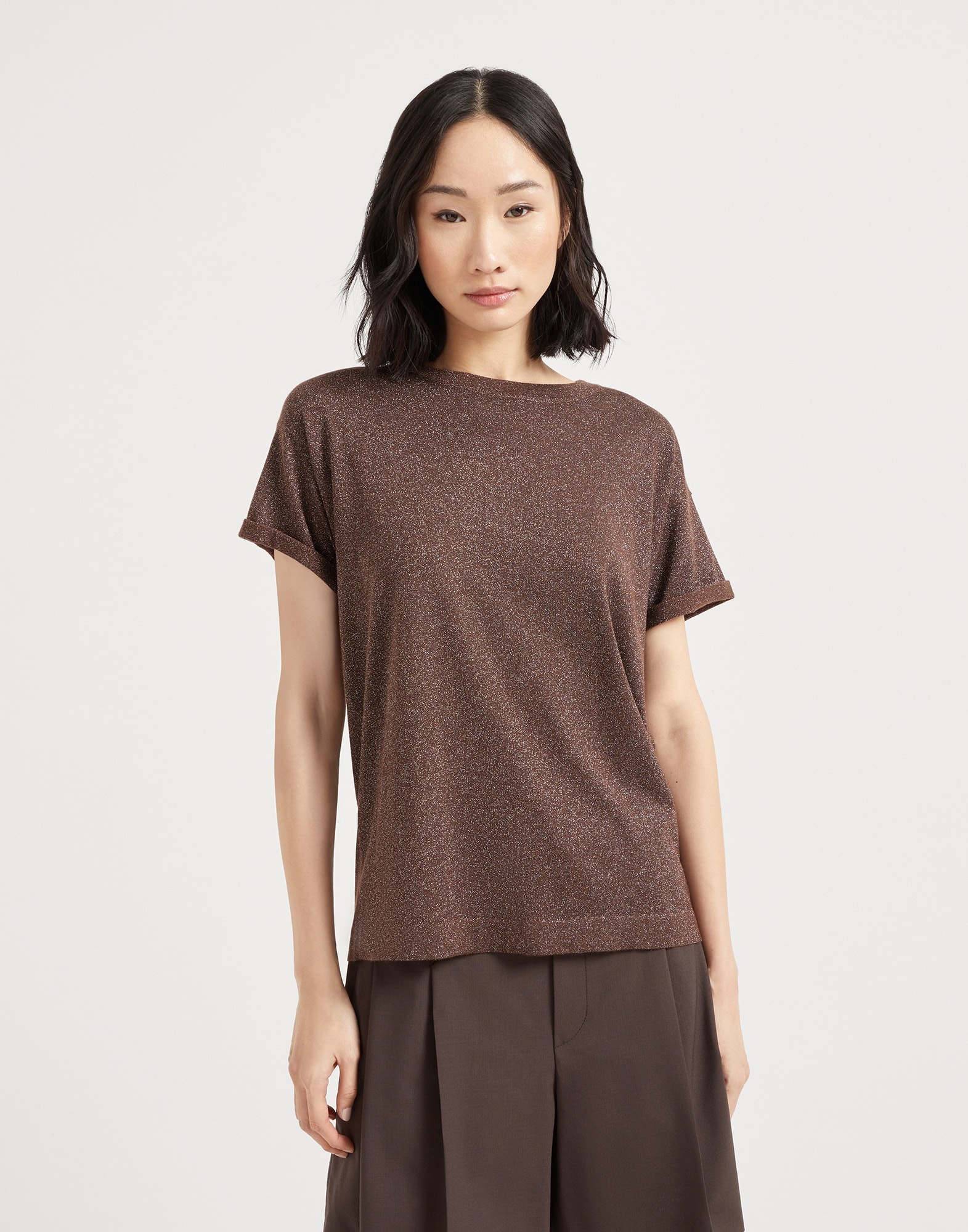 Sparkling metallic reflections enrich the ultra-lightweight cashmere and silk yarn, illuminating the essential lines of this sweater. The knitting of the soft yarn utilizes a lame thread that spreads a delicate shimmer throughout the garment’s surface. The silhouette features regular proportions. MATERIALS Cashmere and silk fibers are manufactured together with a fine lame thread to enrich the texture with delicate metallic reflections. The presence of a synthetic fiber provides added comfort. DETAILS Crew-neck Drop shoulder Sleeves with cuff Plain stitch 51% CASHMERE, 22% SILK, 20% NYLON, 7% POLYESTER