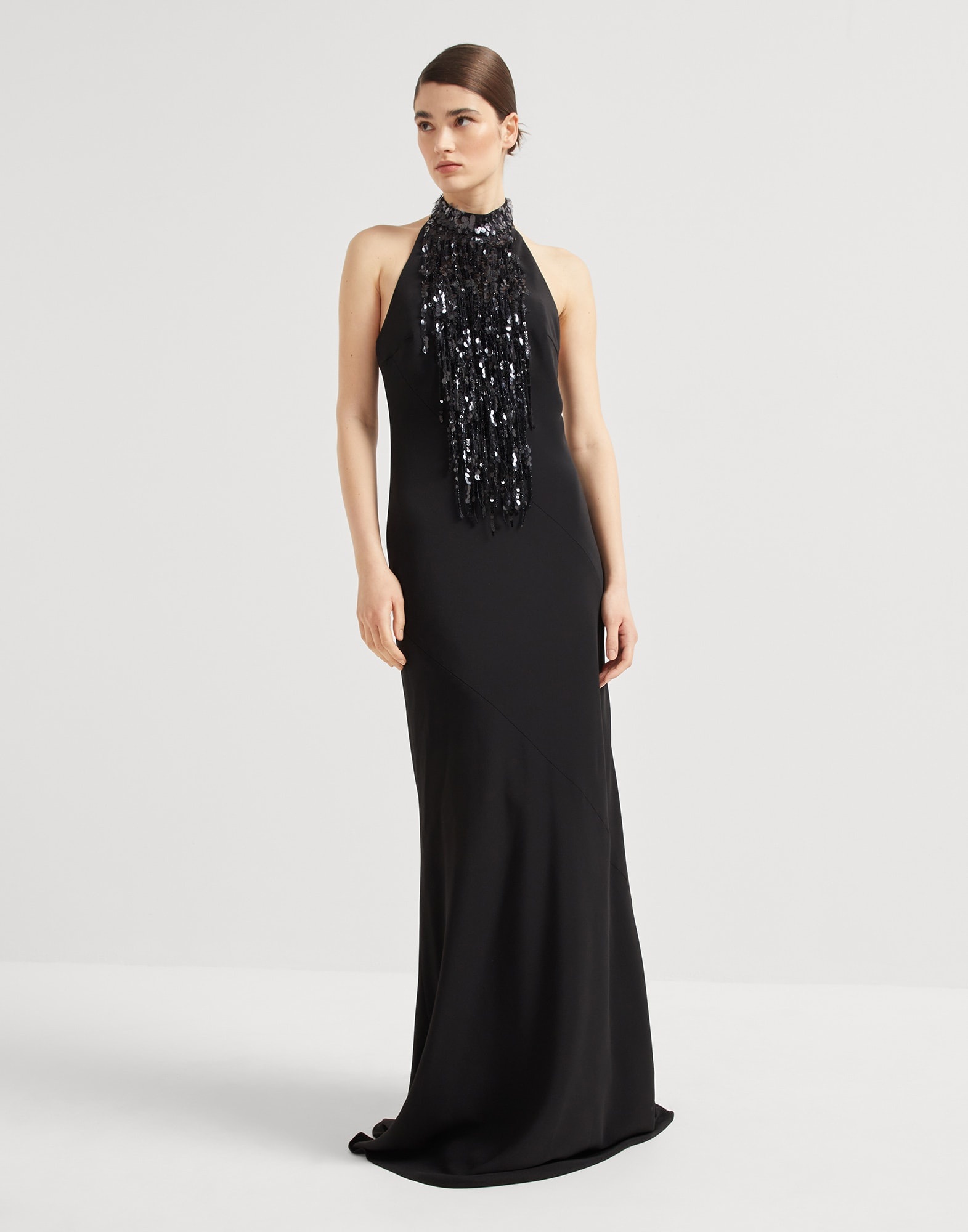 The season’s precious Glistening Waterfall Embroidery enriches this cady crepe long dress. A cascade of fringes with shiny sequins creates a jewelry-like embellishment that spreads shimmering reflections and enhances the essential silhouette. The lightweight, fluid fabric complements the straight, fitted lines with a distinctly feminine feel. MATERIALS A classic fabric of the Brunello Cucinelli collections, the silk and acetate cady crepe is characterized by a slightly crushed appearance and an ultra lightweight texture. DETAILS Button fastening Side zip closure Silk-blend crepe lining Special workmanship Nickel-free monili decoration 52% ACETATE, 48% SILK