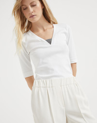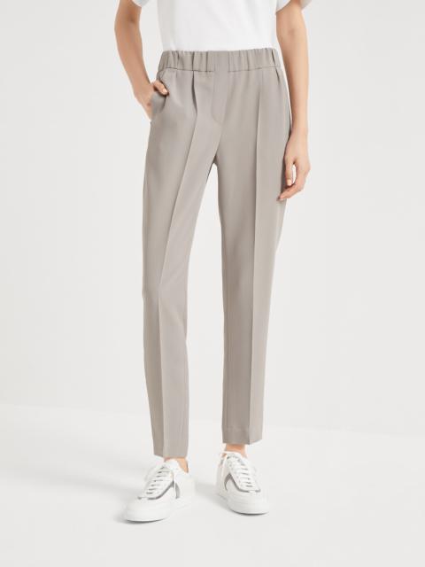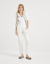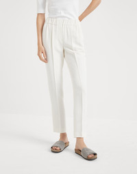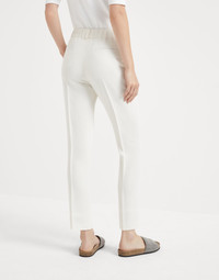 Silk and acetate crepe cady fabric provides a fluid and sophisticated touch to the essential lines of these Tailored Jogger trousers. The regular fit is enhanced by the small pleats that complement the soft proportions in the seat and the regular cut down the leg. The elastic waistband reflects the characteristic silhouette of sporty trousers. MATERIALS A classic fabric of the Brunello Cucinelli collections, the silk and acetate cady crepe is characterized by a slightly crushed appearance and an ultra lightweight texture. DETAILS Pull-up trousers Front pockets Back welt pockets Pleat 52% ACETATE, 48% SILK