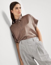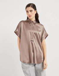Feminine and elegant, this stretch silk satin shirt is enriched with the iconic details of the Brunello Cucinelli collections. The fabric’s characteristic fluid, shimmering texture complements the garment’s soft lines, making it particularly comfortable to wear. A shiny embroidery of fine rows of monili provides a precious touch to the mother-of-pearl buttons closure. MATERIALS Stretch silk satin, an elegant fabric with a shiny effect and flowing hand, represents a classic of Brunello Cucinelli fine materials. A small amount of synthetic fiber adds to wearer comfort. DETAILS Half-length opening with mother of pearl buttons Button-down collar Nickel-free monili decoration 96% SILK, 4% ELASTANE