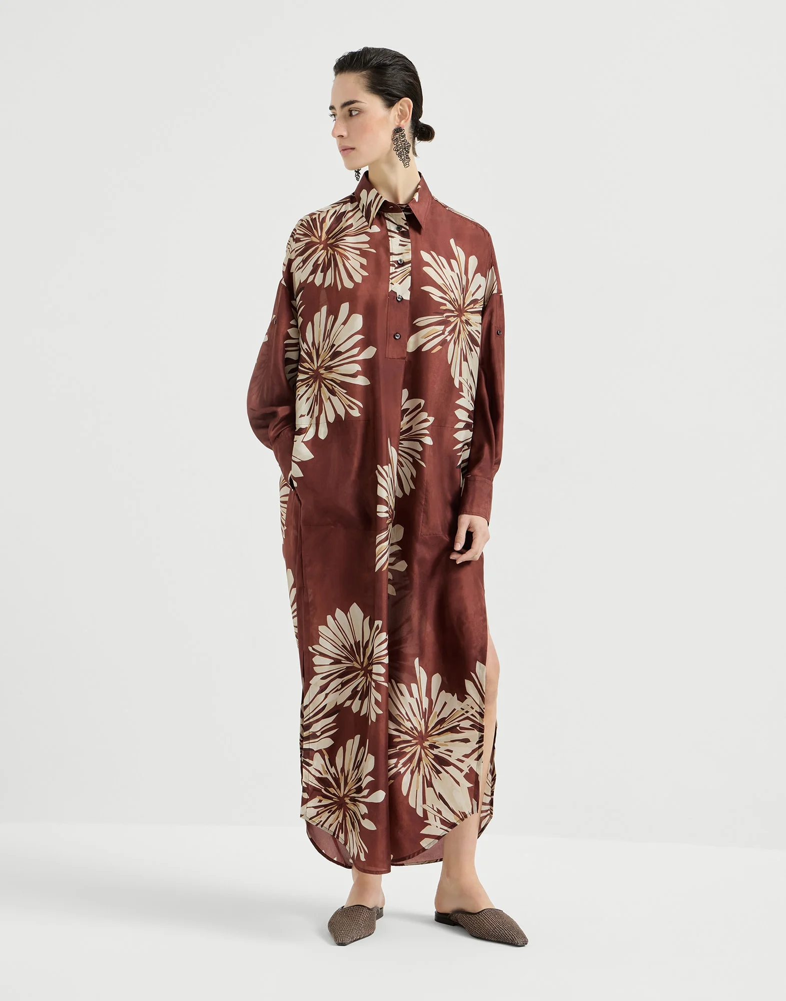 This long dress reinterprets a classic feminine fabric with a pattern inspired by the beauty of nature. Made of fluid, lightweight silk pongee, the garment showcases the season's refined bloom print, depicting a stylized dahlia. The collar and button closure details give the design a casual shirt dress feel, while a shiny monili embroidery on the back of the neck adds a delicate sparkle. MATERIALS Pure silk pongee is a refined fabric characterized by a fluid texture and a semi-glossy appearance. The fabric is printed with a floral motif inspired by the dahlia, delivered in the season’s colors. DETAILS Shirt-style collar Button opening Wide sleeve Drop shoulder Button cuffs Side vents at bottom Nickel-free monili decoration 100% SILK