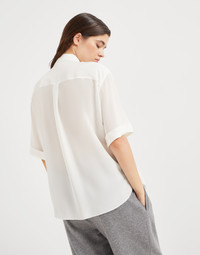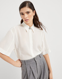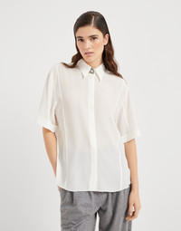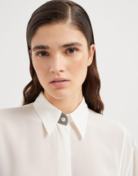 Elegant embellishments enrich the essential style of this silk crepe de Chine shirt. The classic collar is enriched at the base with an embroidery of fine rows of shiny monili, the iconic embellishment of the Brunello Cucinelli collections. The silhouette is comfortable with wide sleeves. MATERIALS Pure silk crepe de Chine is characterized by an ultra-lightweight, fluid hand. The fabric, with notably twisted threads, contributes in making the surface slightly textured and matte. DETAILS Concealed button closure Classic collar Nickel-free monili decoration 100% SILK