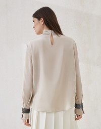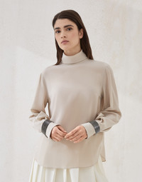 Refined fabrics and elegant embellishments update the essential cut of this new turtleneck T-shirt. Characterized by a light, slightly textured hand, the sophisticated pure silk crepe de Chine perfectly complements the garment’s fluid silhouette. The shimmering, removable embellished cuffs, made of precious tubular beads with a metallic finish, complete the garment with an elegant, sophisticated accent. MATERIALS Pure silk crepe de Chine is characterized by an ultra-lightweight, fluid hand. The fabric, with notably twisted threads, contributes in making the surface slightly textured and matte. DETAILS Teardrop opening with button at back of neck High collar Removable bejeweled embellishment 100% SILK