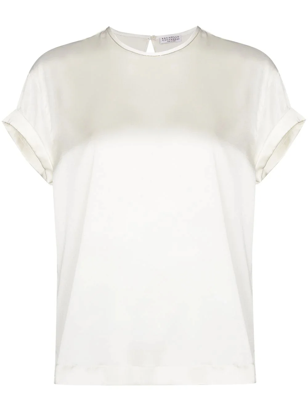 silk crew-neck T-shirt They say you are the company you keep, that’s why we roll with Brunello Cucinelli - in the shape of this white silk T-shirt, that is. Made in Italy Composition Silk 96%, Elastane 4% SIZE & FIT Model measurements Height 5 ft 10 in(1.79 m) Bust/Chest 31.88 in(81 cm) Hips 35.43 in(90 cm) Waist 23.62 in(60 cm) Measurement LENGTH 25.59 in(65 cm) FittingInformation This piece fits true to size. We recommend you get your regular size Cut for a loose fit Made with a mid-weight fabric Washing instructions Hand Wash