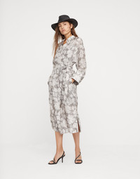Silk ginkgo print pongée shirt dress with belt and shiny cuff details