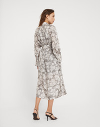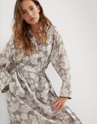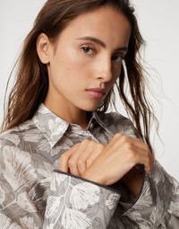 The season’s patterns and retro inspiration define this silk pongee shirt dress. Delivered in the season’s colors, the Ginkgo Print enriches the look of the fabric with a stylized reproduction of the very ancient plant. The d-ring waist belt gathers the garment’s soft volume. Furthermore, two delicate monili embroideries add a touch of sparkle to the edge of the cuffs. MATERIALS A classic material from the Brunello Cucinelli Womenswear collections, silk pongee is updated with the season’s new Ginkgo Print. DETAILS Classic collar Concealed button closure Drop shoulder Detachable ring belt Nickel-free monili decoration 100% SILK