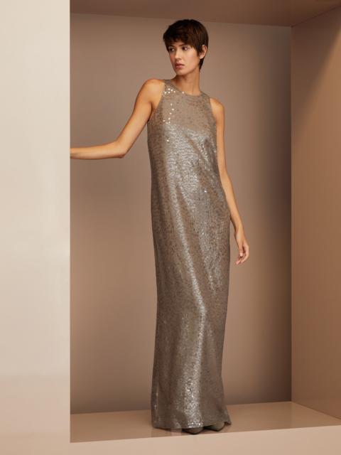 A mix of refined materials and precious details defines the elegance of this crispy silk maxi dress. The fabric’s ethereal, slightly crisp texture complements the feminine silhouette, enhanced by a sophisticated American neckline. The skirt’s fluid, wide volume creates a sense of movement and lightness, while the shimmering, precious monili bejeweled collar completes the garment with an elevated sparkle in perfect Brunello Cucinelli style. MATERIALS Refined Crispy silk is an ultra fine fabric characterized by a transparent, matte look. The fabric’s delicate color stems from a particular dye that preserves the fiber’s natural textured effect. DETAILS High open collar with buttons Concealed back zip closure Silk-blend crepe lining Nickel-free monili decoration 100% SILK