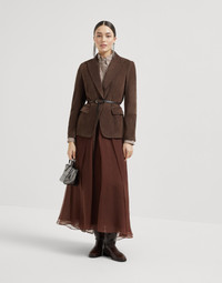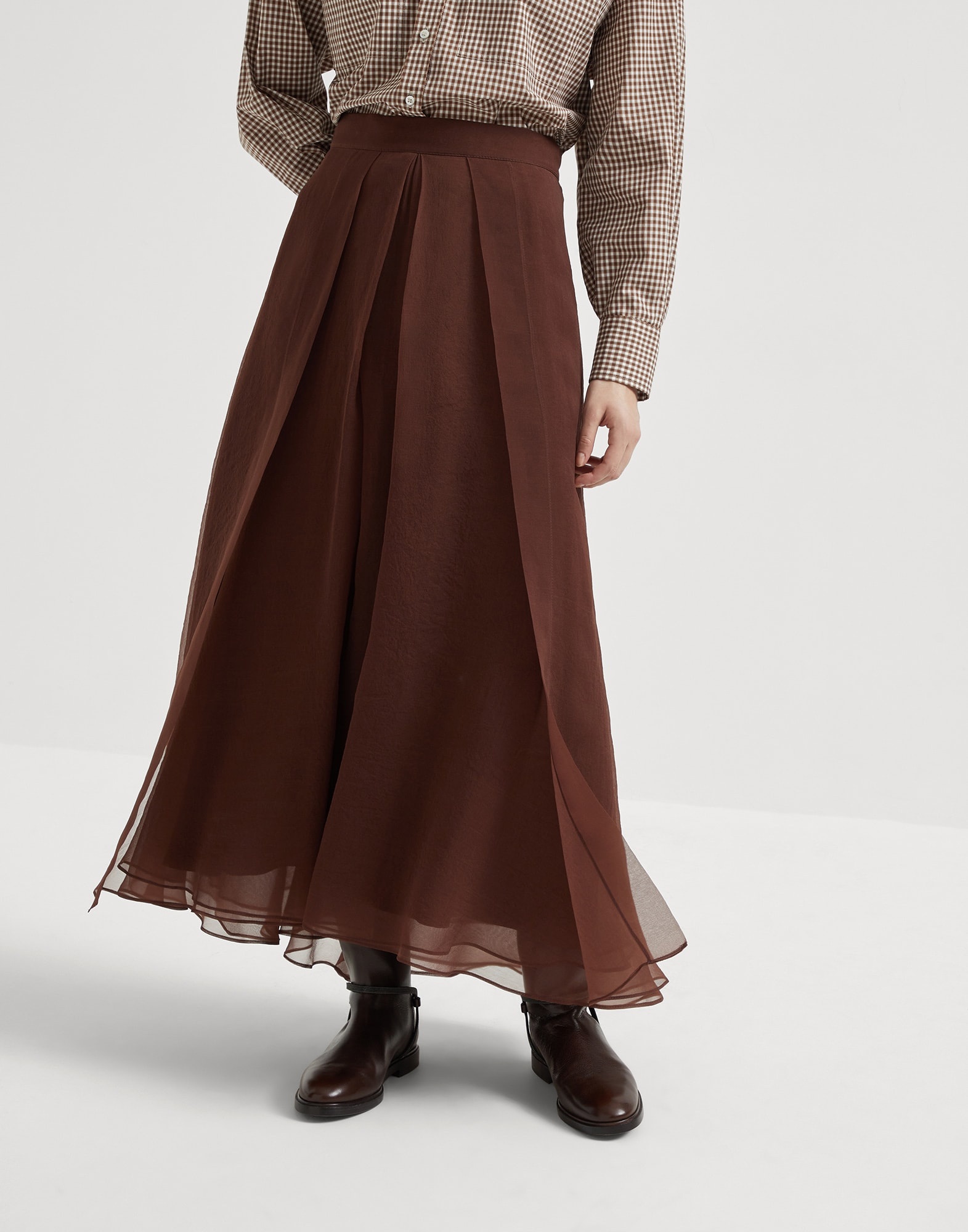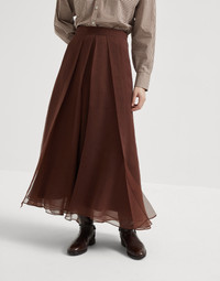 Refined materials and a distinctly feminine style bring life to this new paneled circle skirt. Ultra-lightweight Crispy silk panels of different lengths are layered to enrich the garment with a sense of movement and volume. The elegant fabric’s ethereal, impalpable appearance accentuates the slightly flared silhouette at the bottom, while the pull-on fit emphasizes the garment”s comfort. MATERIALS Refined Crispy silk is an ultra fine fabric characterized by a transparent, matte look. The fabric’s delicate color stems from a particular dye that preserves the fiber’s natural textured effect. DETAILS Back zip closure Silk-blend crepe lining 100% SILK