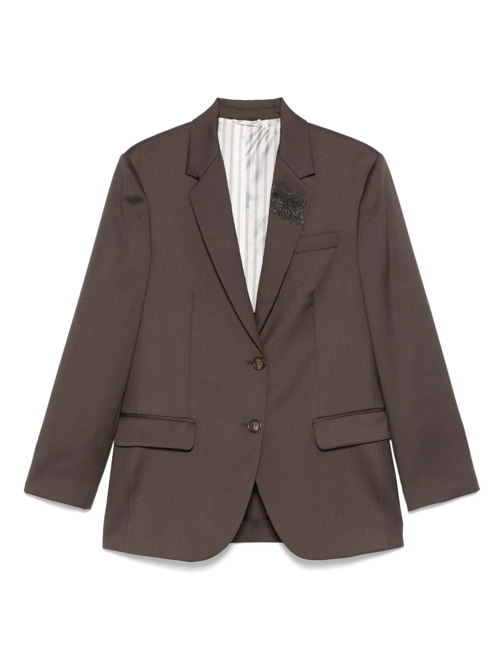 single-breasted blazer Highlights - Brown - Front button fastening - Long sleeves - Two side flap pockets Made In Italy Composition Outer: Eco Brass 100%, Virgin Wool 70%, Mohair 30% Lining: Cupro 100%, Acetate 74%, Silk 26% SIZE & FIT Model measurements Height 5 ft 10 in(1.78 m) Bust/Chest 33.85 in(86 cm) Hips 36.61 in(93 cm) Waist 26.77 in(68 cm) FittingInformation Designed for a slim fit that sits just away from the body offering a close yet comfortable fit The internal shoulder pads offer a structured shape Made from a midweight non-stretch fabric