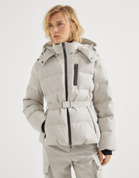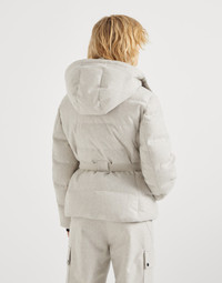 Functional elements and refined materials are the inspiration for this Mountain down jacket, designed for being active at high altitudes. A classic fabric of masculine elegance, bonded virgin wool flannel is paired with sporty details, such as a detachable hood and buttonhole cuffs, for optimal protection. The warm goose down and feather padding accentuates the garment’s volume, which is gathered at the waist by a practical belt. An elegant shiny monili embroidery enriches the chest pocket for a sparkling note in true Brunello Cucinelli style. The down jacket is perfect to match with the trousers in the same fabric to create coordinated pieces in the Mountain style. MATERIALS Crafting of the pure virgin wool flannel enhances the noble qualities of the natural fiber, giving it the classic soft, semi-full appearance. A thin membrane ensures the right protection from the elements, without compromising lightness. DETAILS Two-way zip closure Detachable drawcord hood with lining Upper pocket with zipper Hand pockets with zipper Detachable belt with loops Windproof cuffs Elastic cuffs with gaiter Elasticized hem Lined High quality goose down fill All padding is certified according to the RDS (Responsible Down Standard) Nickel-free monili decoration 100% VIRGIN WOOL