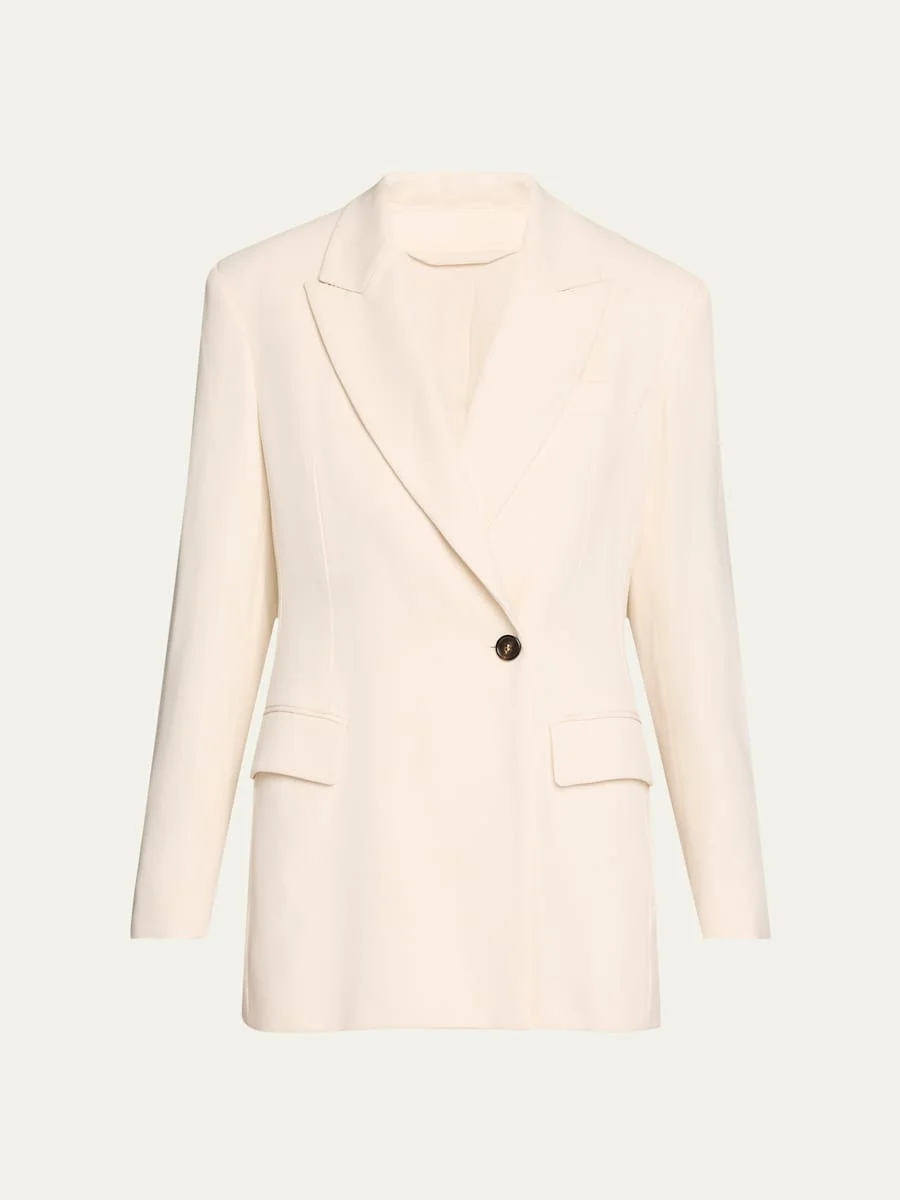 Brunello Cucinelli blazer jacket featuring a diagonal contrast button and padded shoulders Peak lapels; double-breasted front Long sleeves; button cuffs Chest welt pocket; side flap pockets Straight fit Center-back vented hem Viscose/elastane Lining: Acetate/silk Dry clean Made in Italy Model is 5'10"/177cm. Online Inquiries: BGS21_B9MH4| Store Inquiries: #4915209