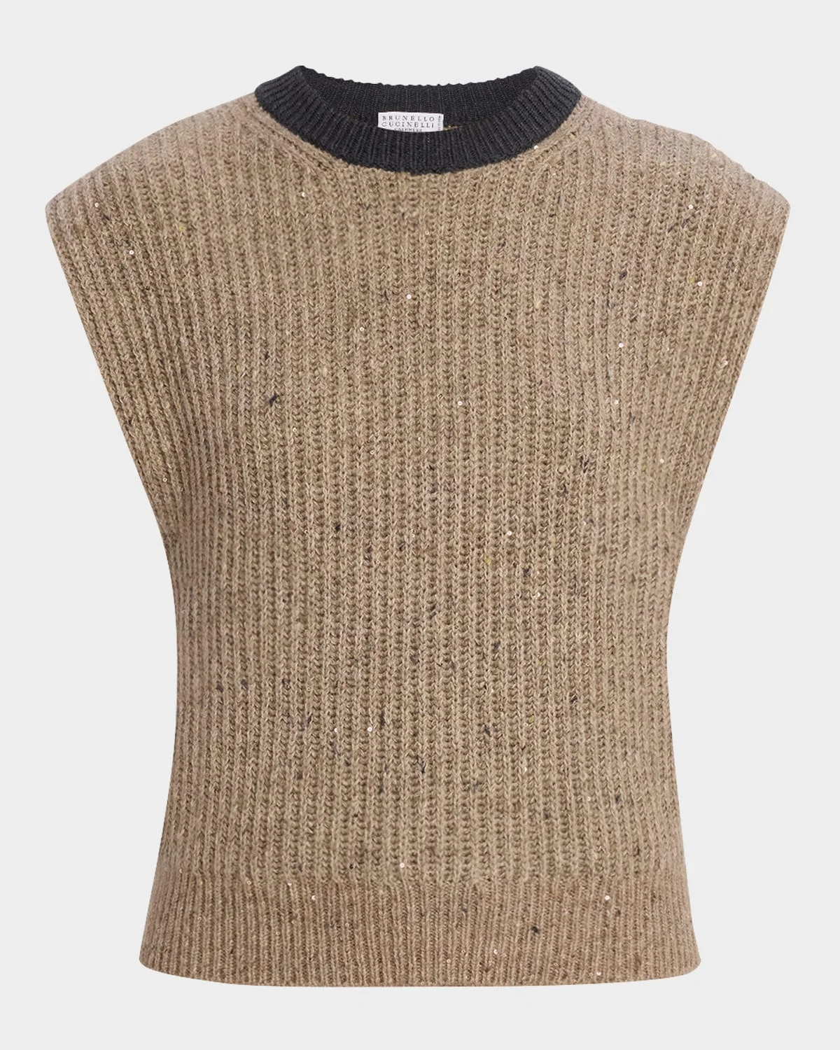 - Brunello Cucinelli two-tone wool-cashmere sweater finished with sequin-embellishment - Crew neckline - Cap sleeves - Classis fit - Hem falls to the hip - Pullover style - Virgin wool/mohair/cashmere - Made in Italy